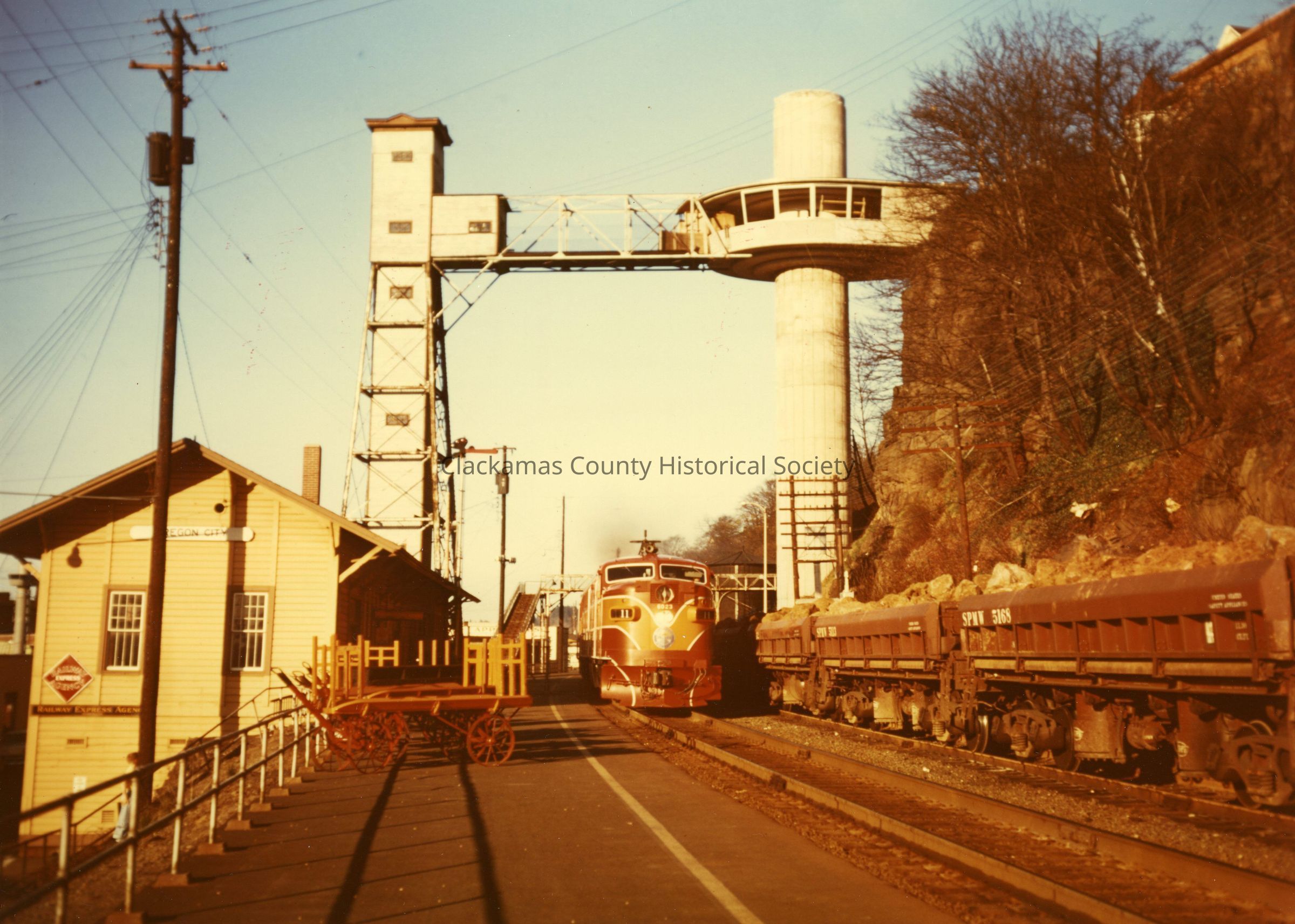 Oregon City elevator. Old and new elevator north view on the railroad tracks with train. Loaded gondola cars. Color photo. Train Depot on left.Made/Created