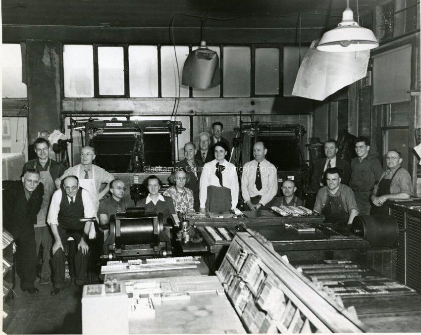 Complete Staff of the Oregon City Enterprise, last day, 1945 - includes Josie Barnett. Back of photo lists members as follows (L-R):