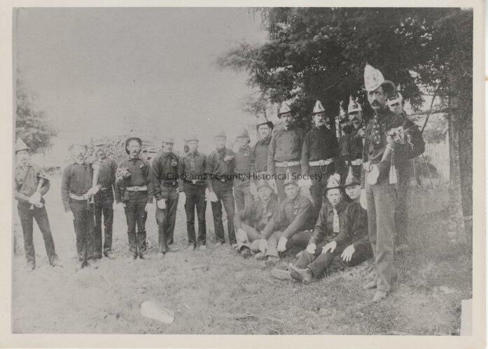 Oregon City Fire Dept. Fountain Hose Cart Company. Ready for Parade to Cemetary. Decoration Day Parade May 31, 1891