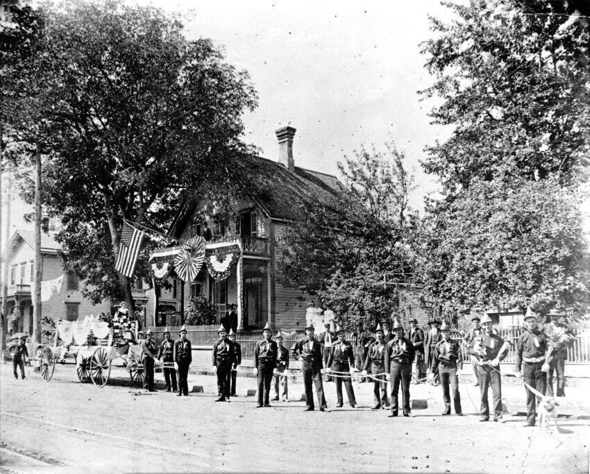 Fourth of July Parade, Oregon City, 1893 or 1894. Hook and Ladder Fire Department. 7th and Main Streets. Thomas Charman House, Dr. W. E. Carll's House and Office. Dr. Carll's house would be turned toward the river and moved back in 1894 for the Barclay Building see P-1225 (JAH 12/2022)Made/Created