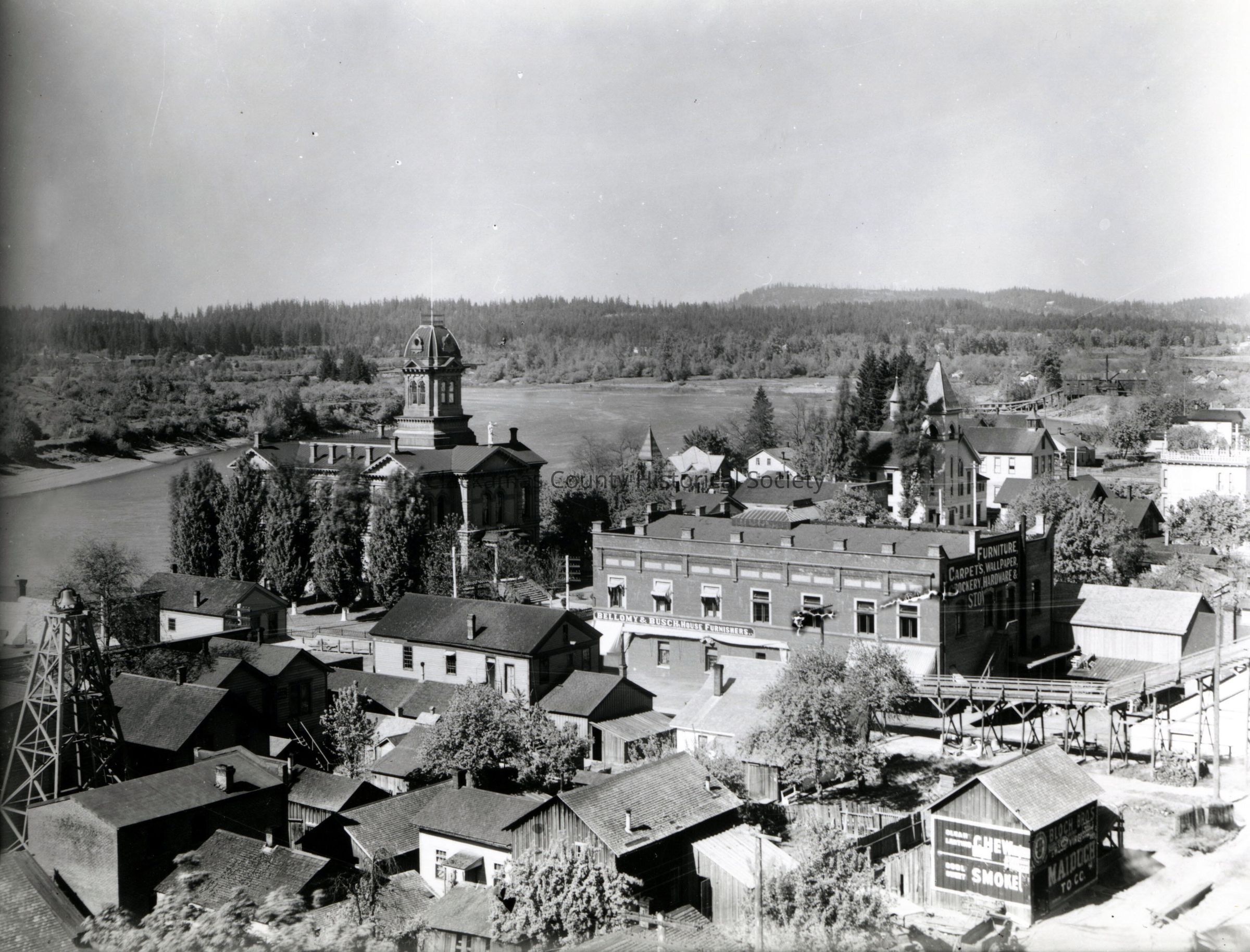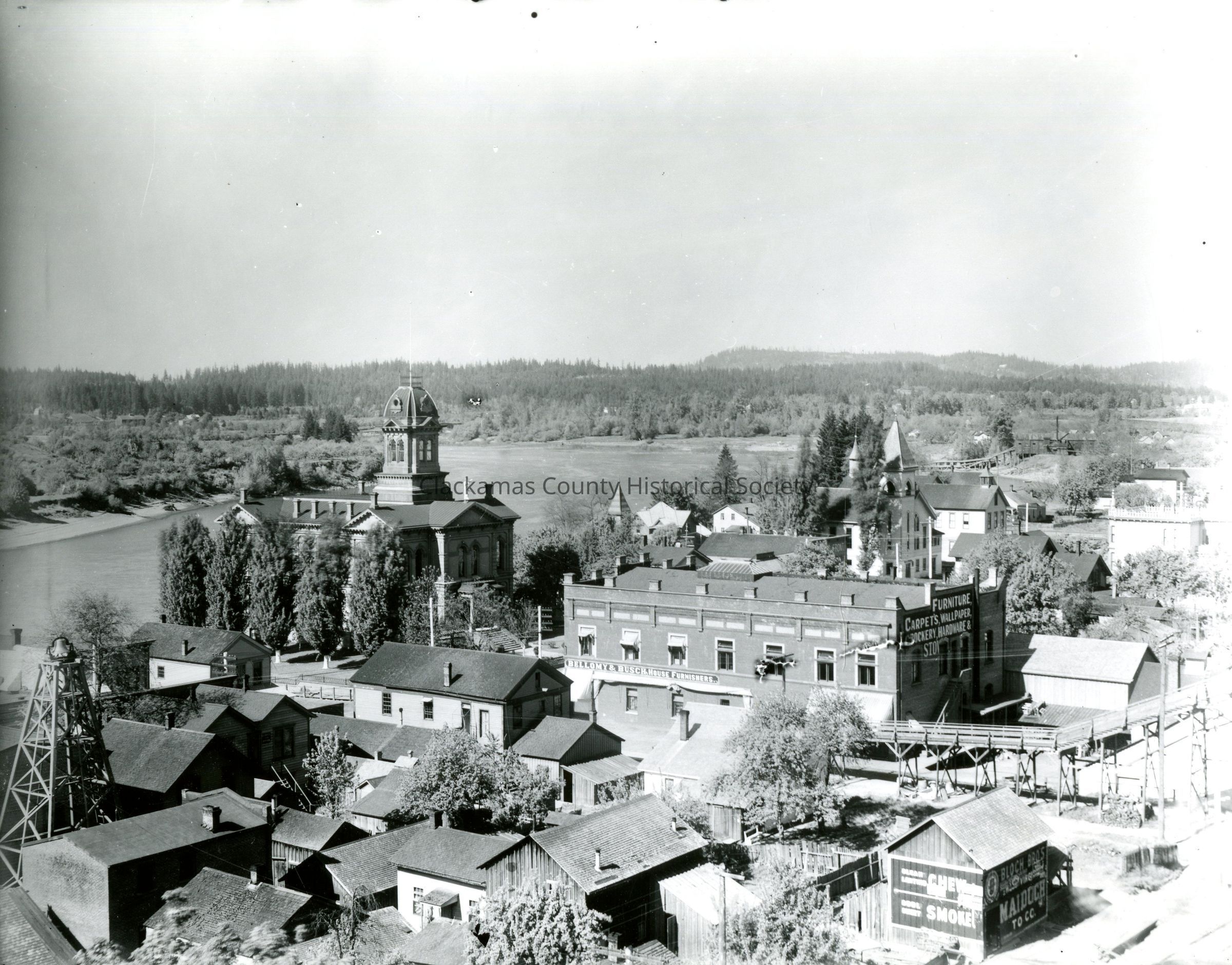 Oregon City from Bluff looking down Willamette River, 1896. Photo shows Courthouse.Made/Created