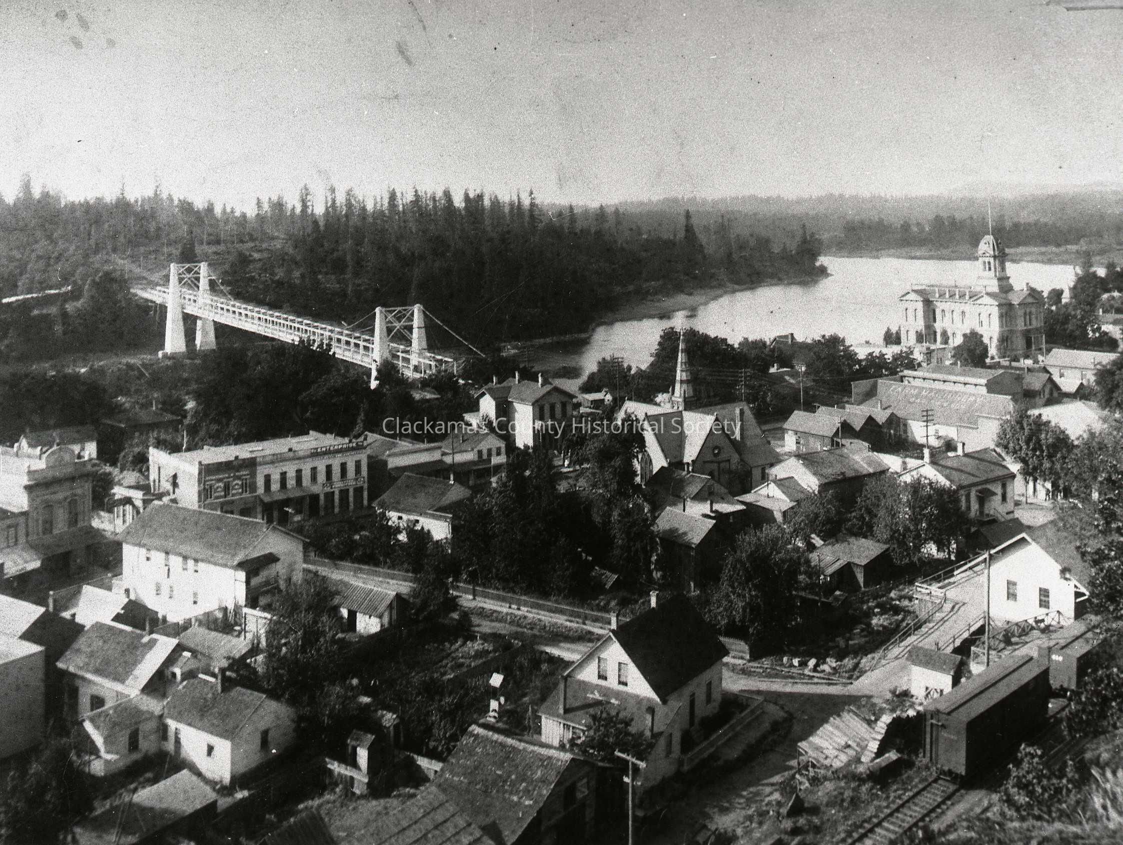 Oregon City from 5th Street Steps on the Bluff, looking down river 6th and Main to 8th and Main.Made/Created