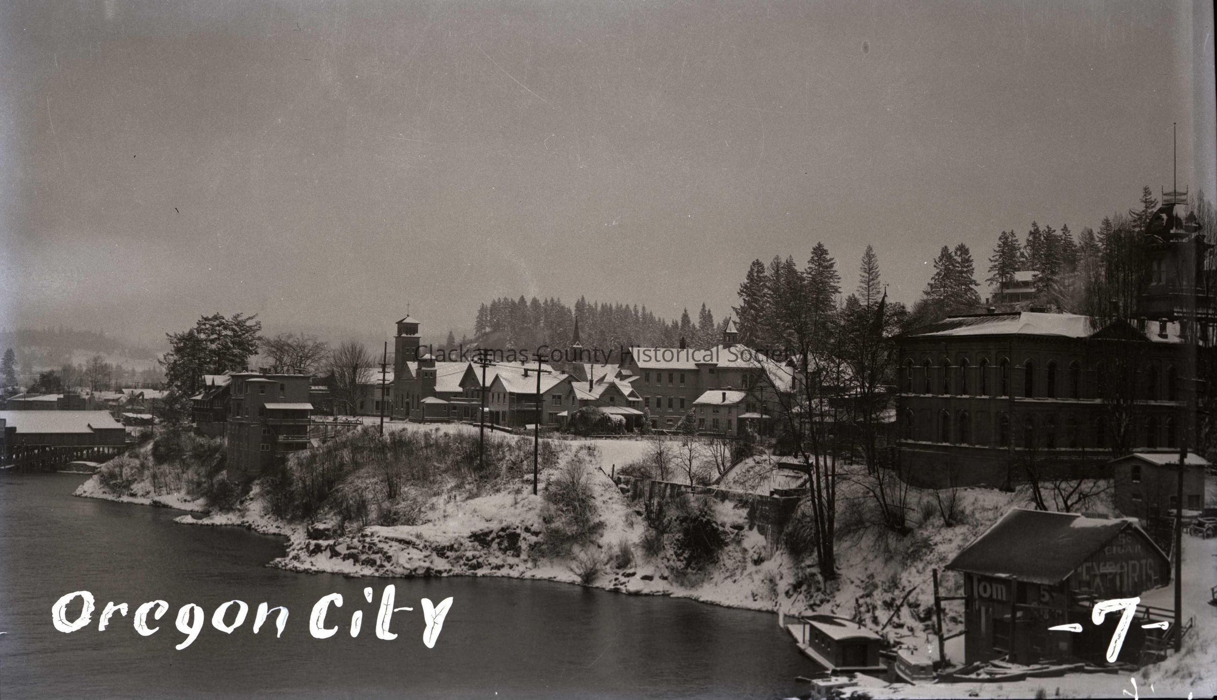 Oregon City from the bridge showing back of court house (8th and Water St. to 10th and Water Street).Made/Created
