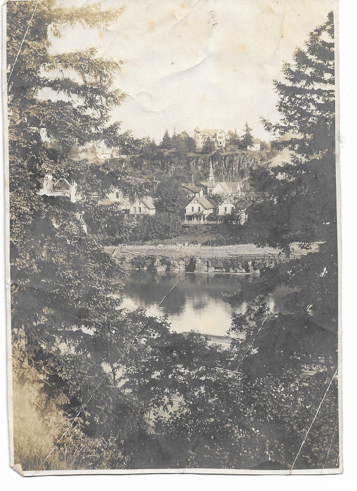 Very old photograph. Taken from across the Willamette river at Oregon City. Clearly shows the bluff and the spire of a church. Very large house on the bluff.
