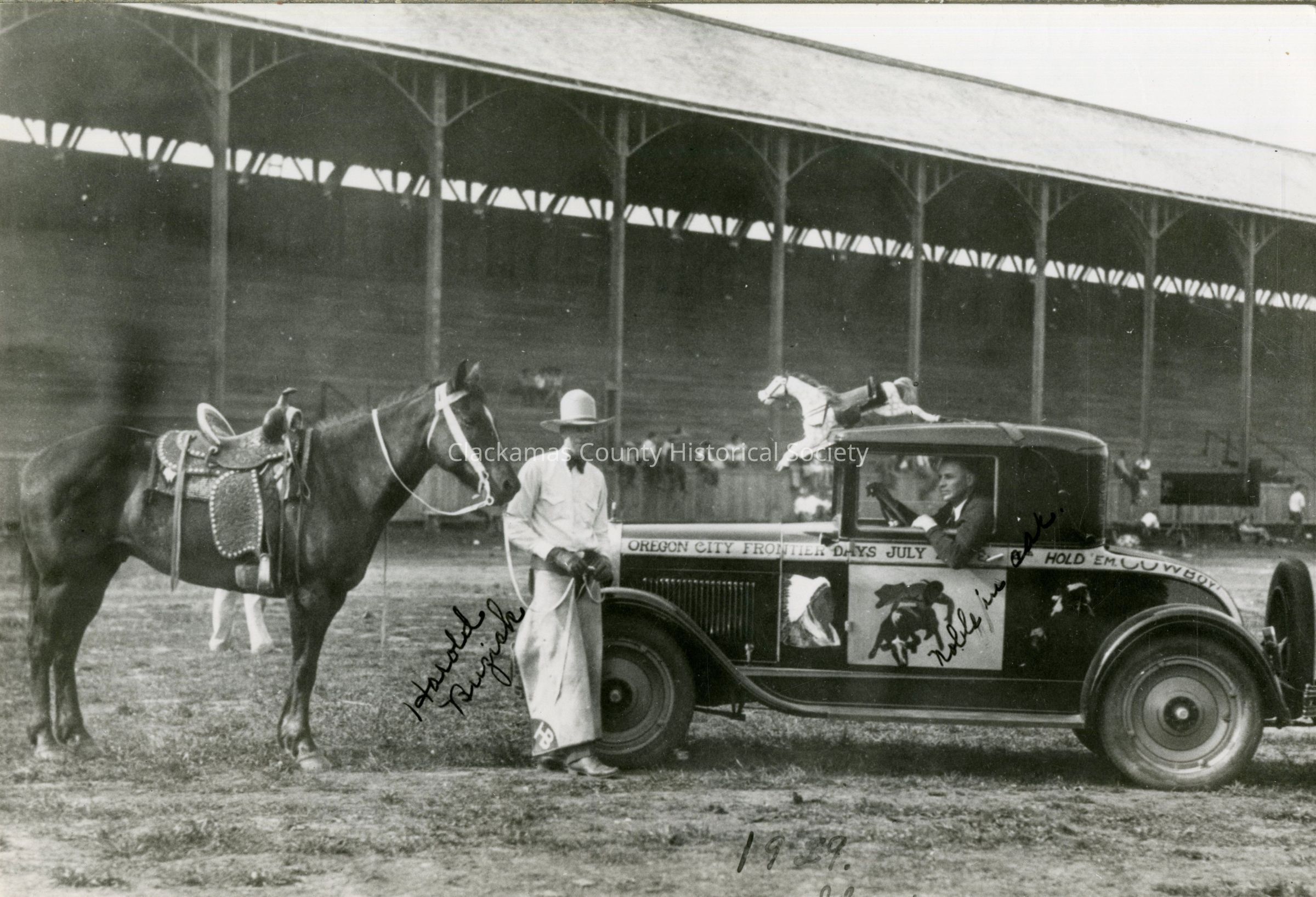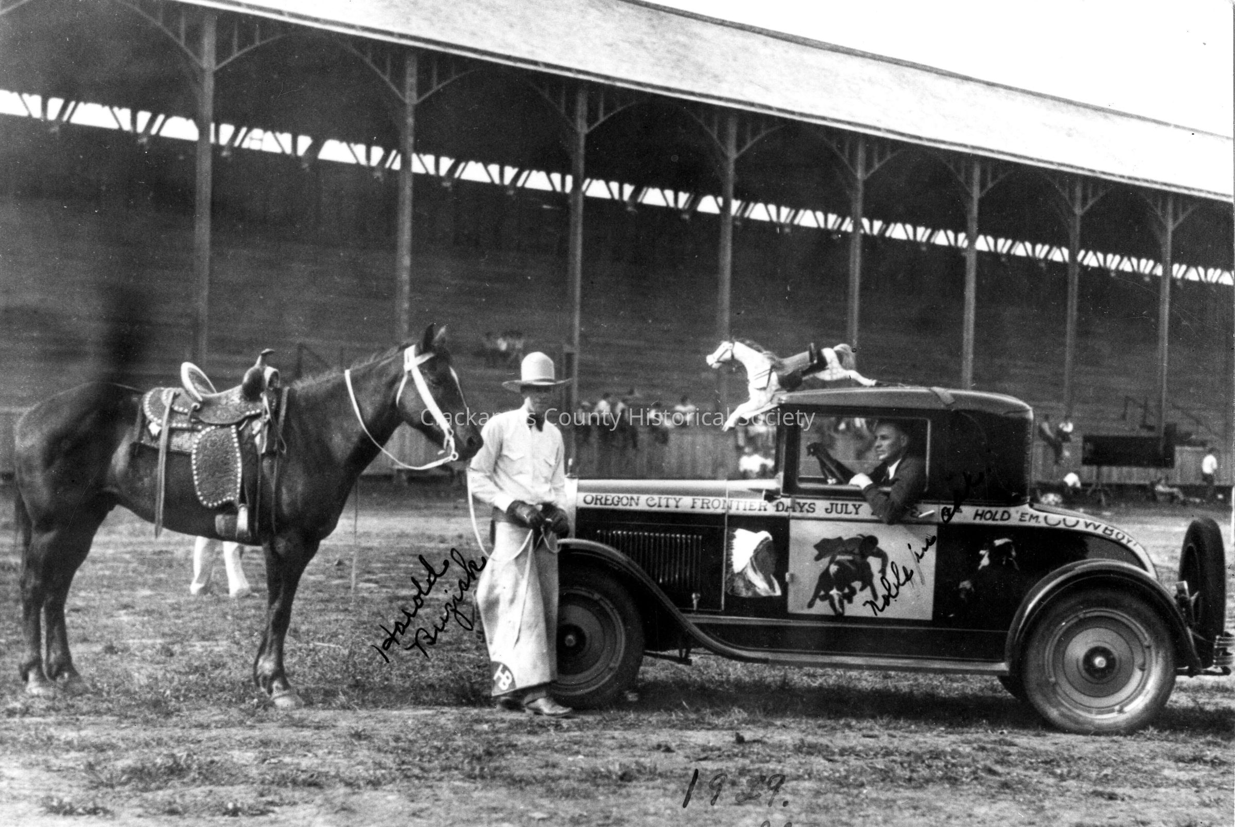 Frontier Days. Horse and rider and old car at Kelly Field. 1929 on front of photos. Harold Buzick name on photo of horseman. Other writing on auto, but hard to read. Looks like Noble Reaksecker.Made/Created