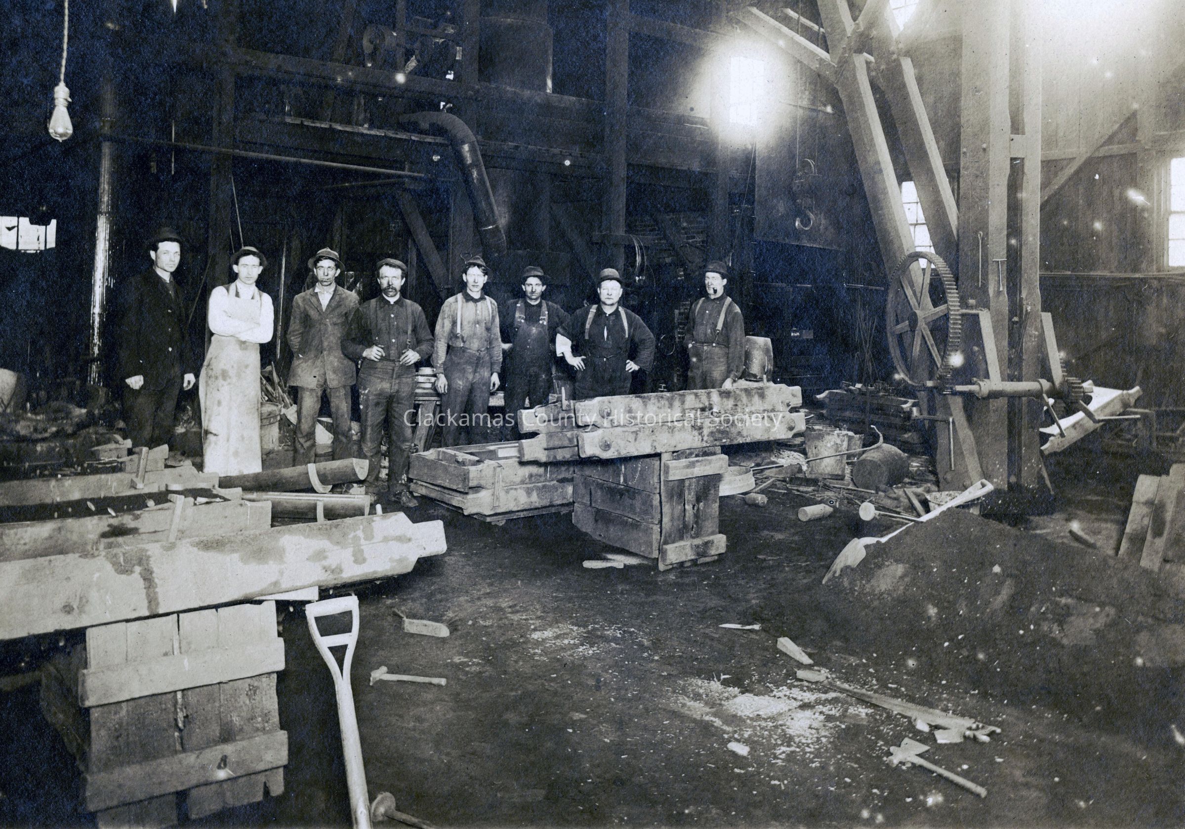 Oregon City Ironworks. 1907-09. Photo identifies six out of eight men: 1) Bert Roake, 2) Jack Varley, 3) Unknown, 4) Bill Massman, 5) Unknown, 6) Bill Rivers, 7) Case (no first name), and 8) Jack Riley.Made/Created