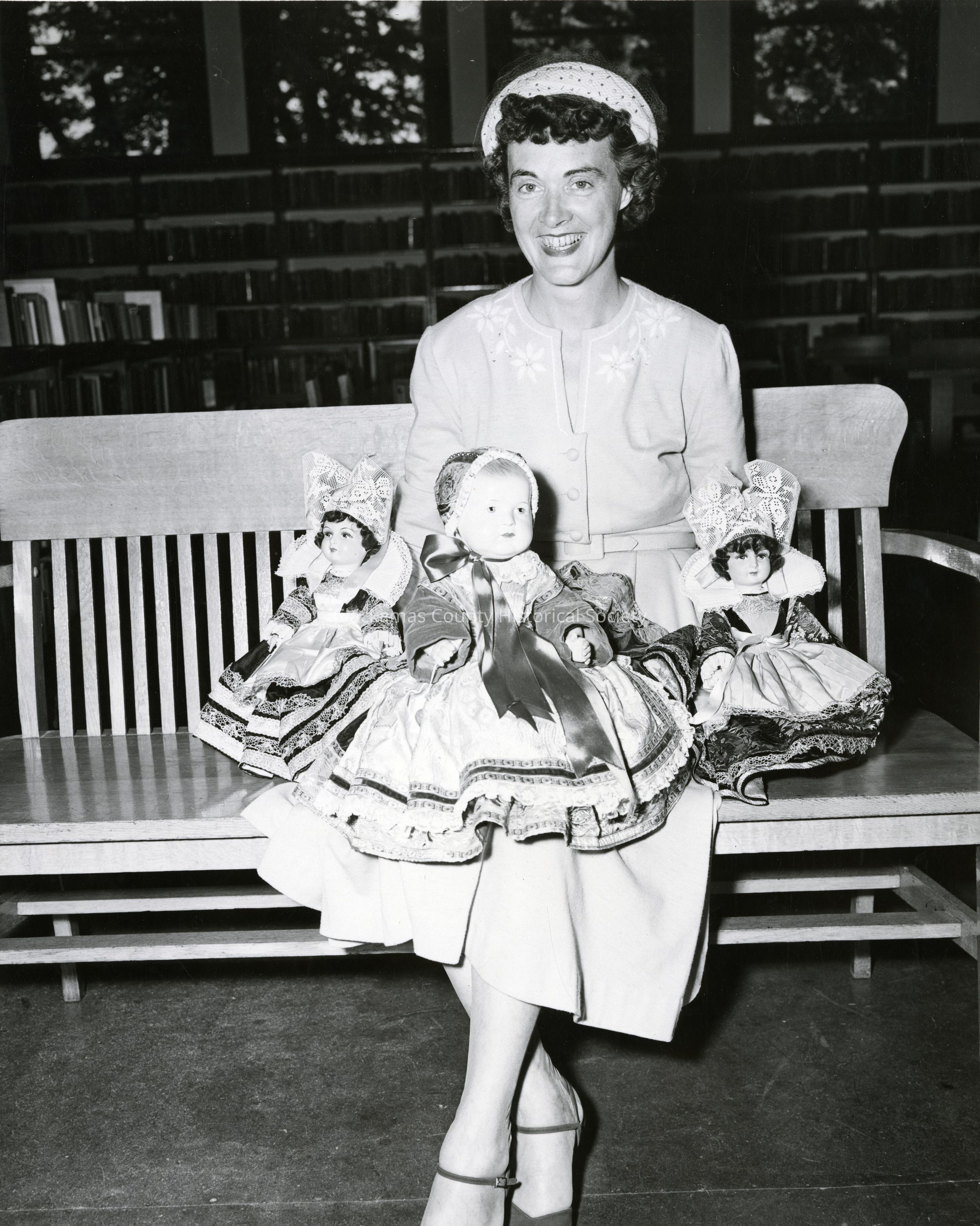 Oregon City Oregon Public Library Dolls. A photograph of lady holding dolls in 1952.