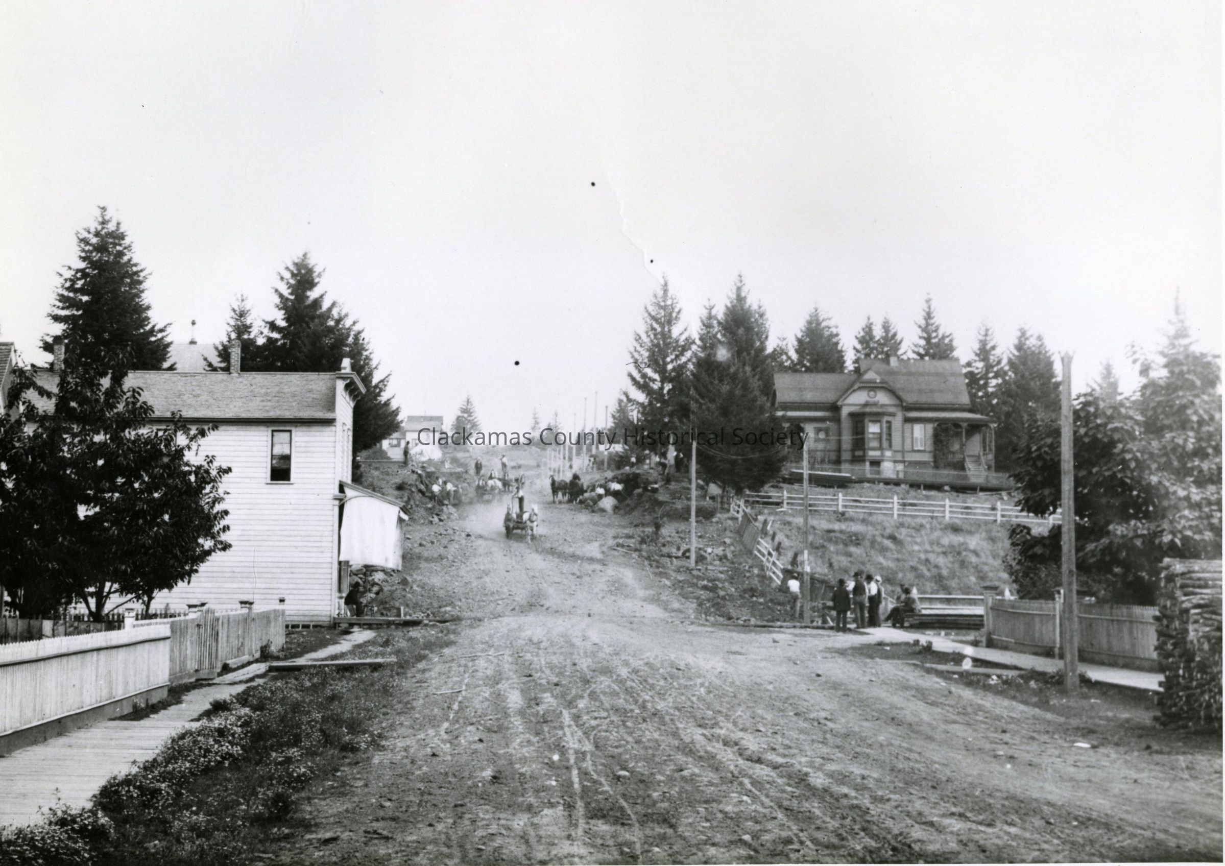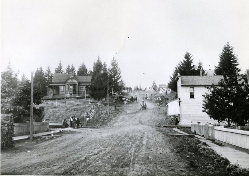 Oregon City looking up 7th Street at Washington, 1899. Photo shows workers grading the dirt road.Made/Created