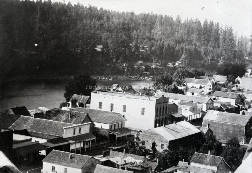 Oregon City Looking West from the Bluff. Brick building in center is the Pope Hardware Store and Hall, the first teatre built in 1873.Made/Created
