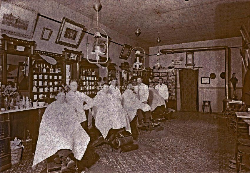 OK Barber Shop. 705 Main Street, Oregon City. 1910. Interior. Customers and barbers.