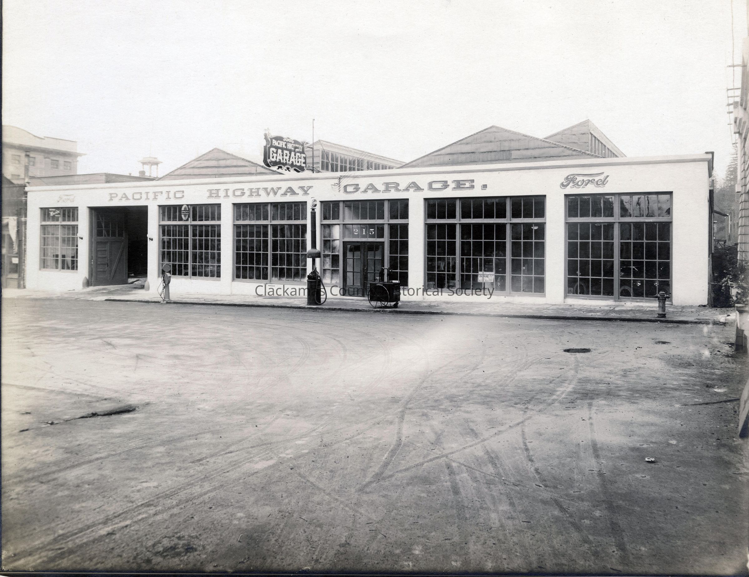 Pacific Highway Garage showing front of garage, gas pump, and oil cart. Ford. On 7th Street, west of elevator.Made/Created