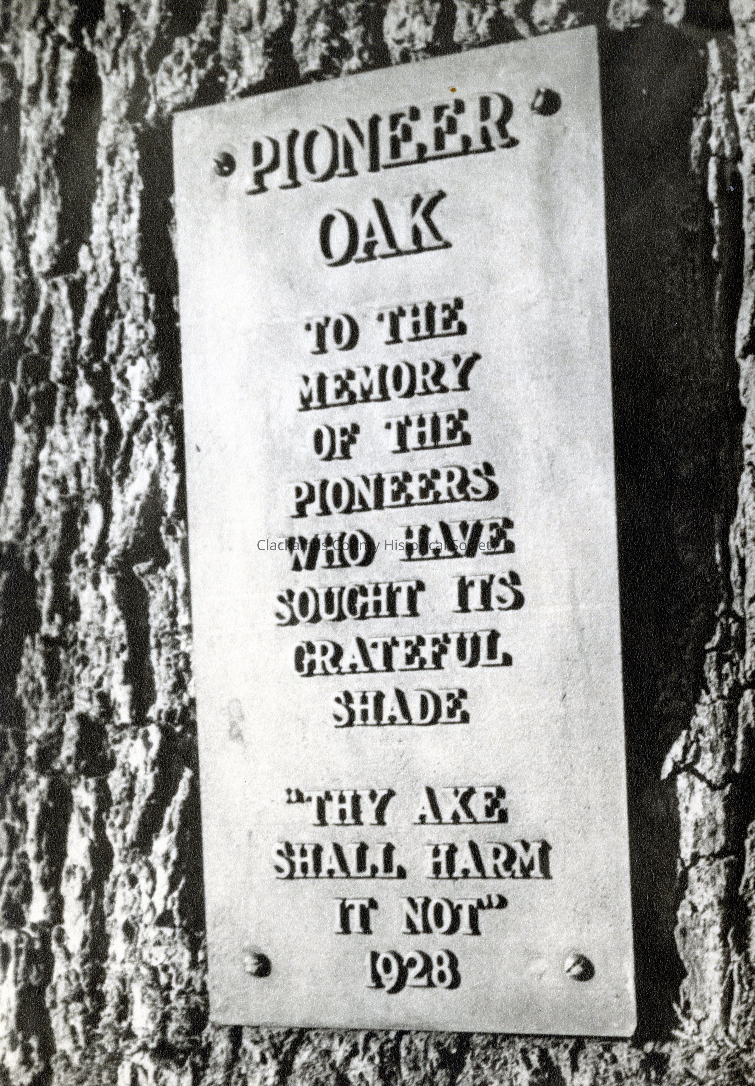 "Pioneer Oak To the Memory of the Pioneers Who have sought its Grateful Shade "Thy Axe Shall Harm it Not" 1928"Made/Created