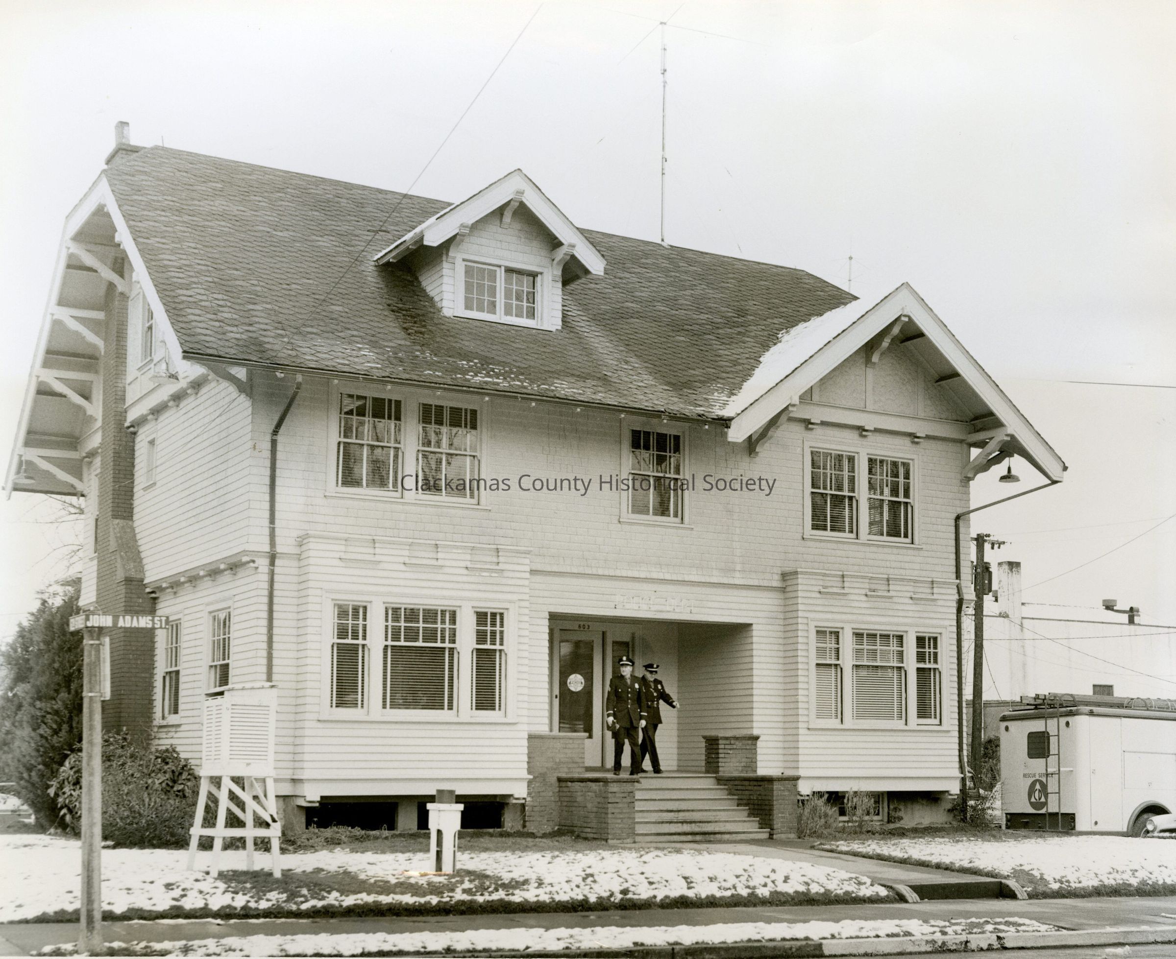The Oregon City Police Station was once the home of lawyer Joseph Hedges and his family, at 6th and John Adams Streets. Police sergeants Robert Chester (on left) and Stanley Orzechowski (on right) check out for routine patrols. The civil defense emergency truck, police cars and other emergency equipment are headquartered on a parking lot between the police station and the city hall. The property was part of the original Robert Caufield holdings.