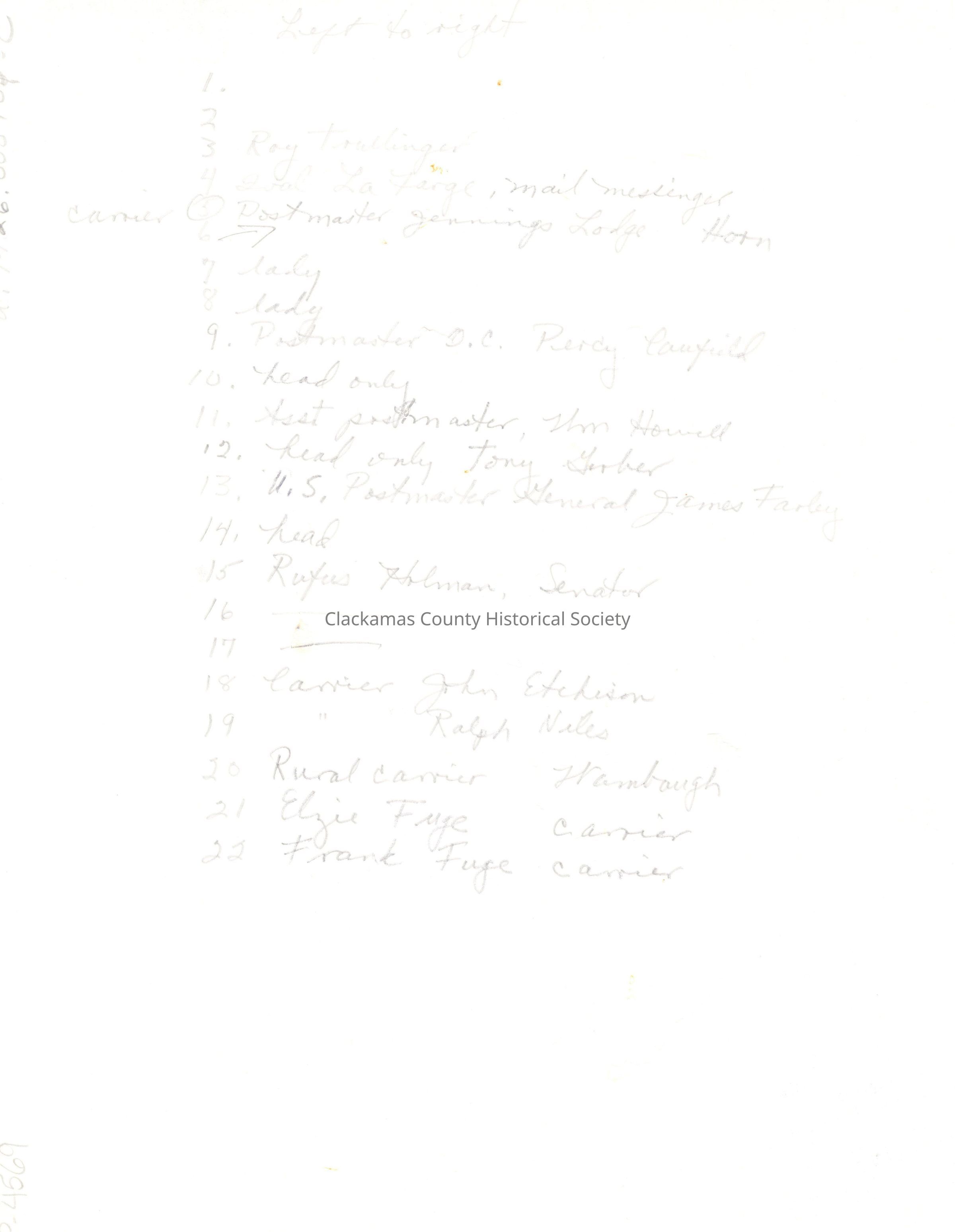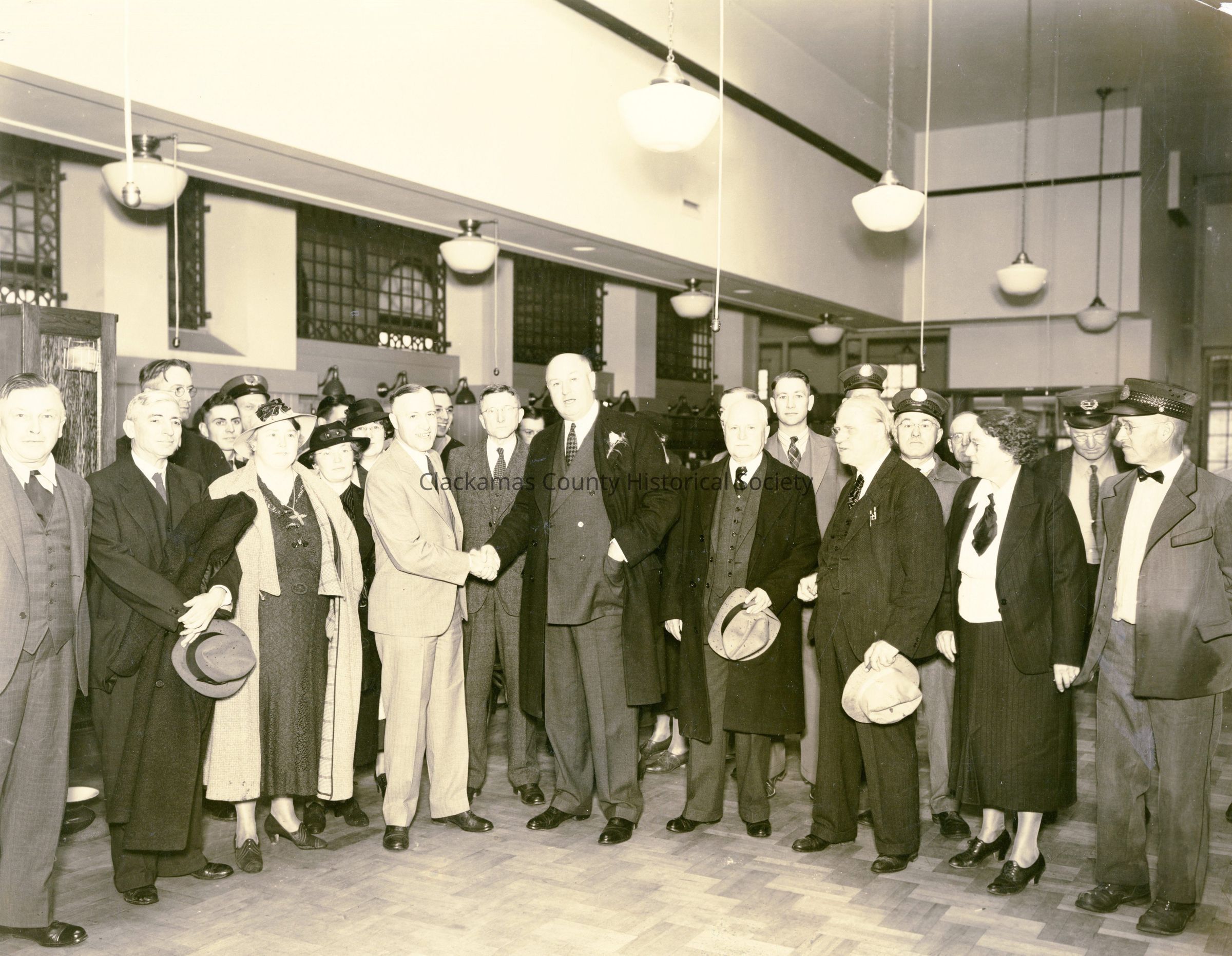 Dedication of Oregon City post office, 1939. (5th and Main Street) Shaking hands are Percy Caufield (Oregon City postmaster) and James Farley (Postmaster General with carnation). Others listed on back are assorted community dignitaries and mail carriers. 12/18/1939