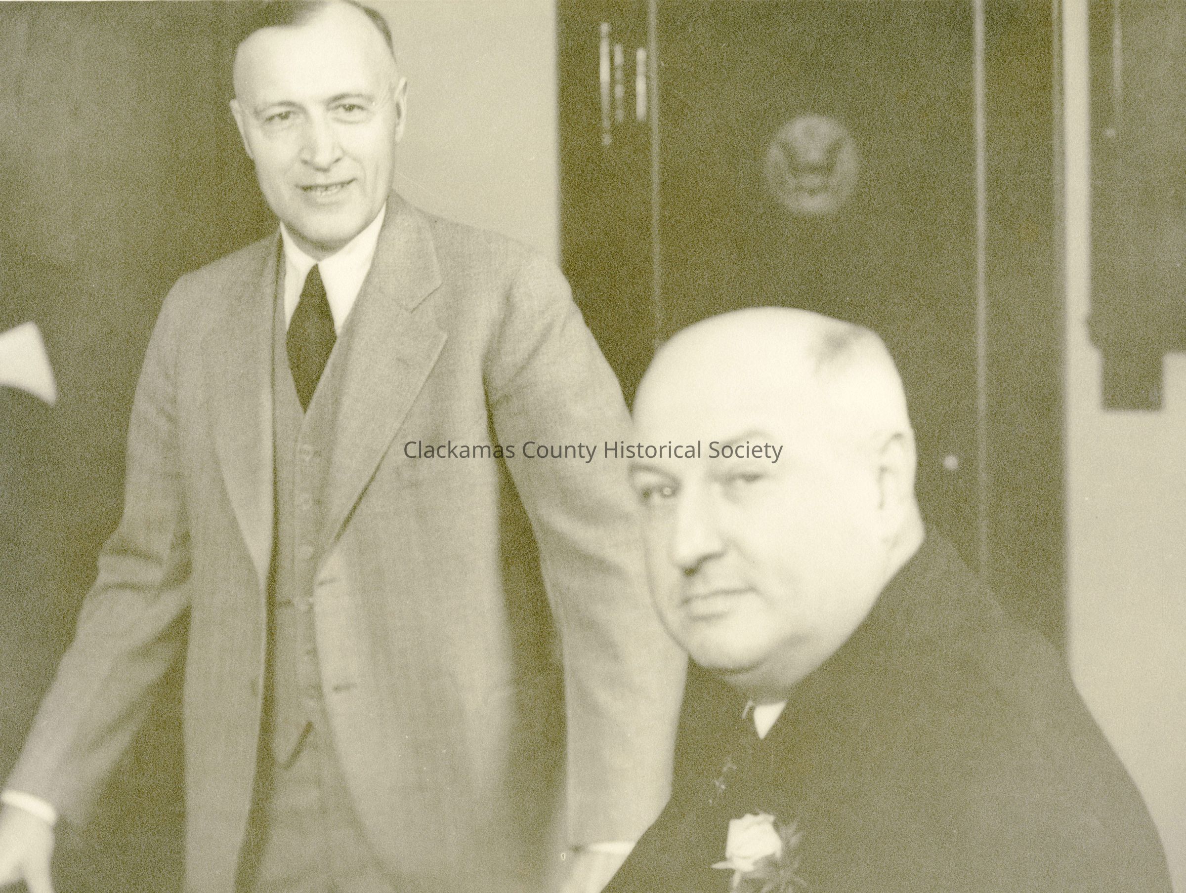 Dedication of Oregon City post office, 1939. Postmaster Percy Caufield, (L) and Postmaster General James Farley (R)Other Names and Numbers