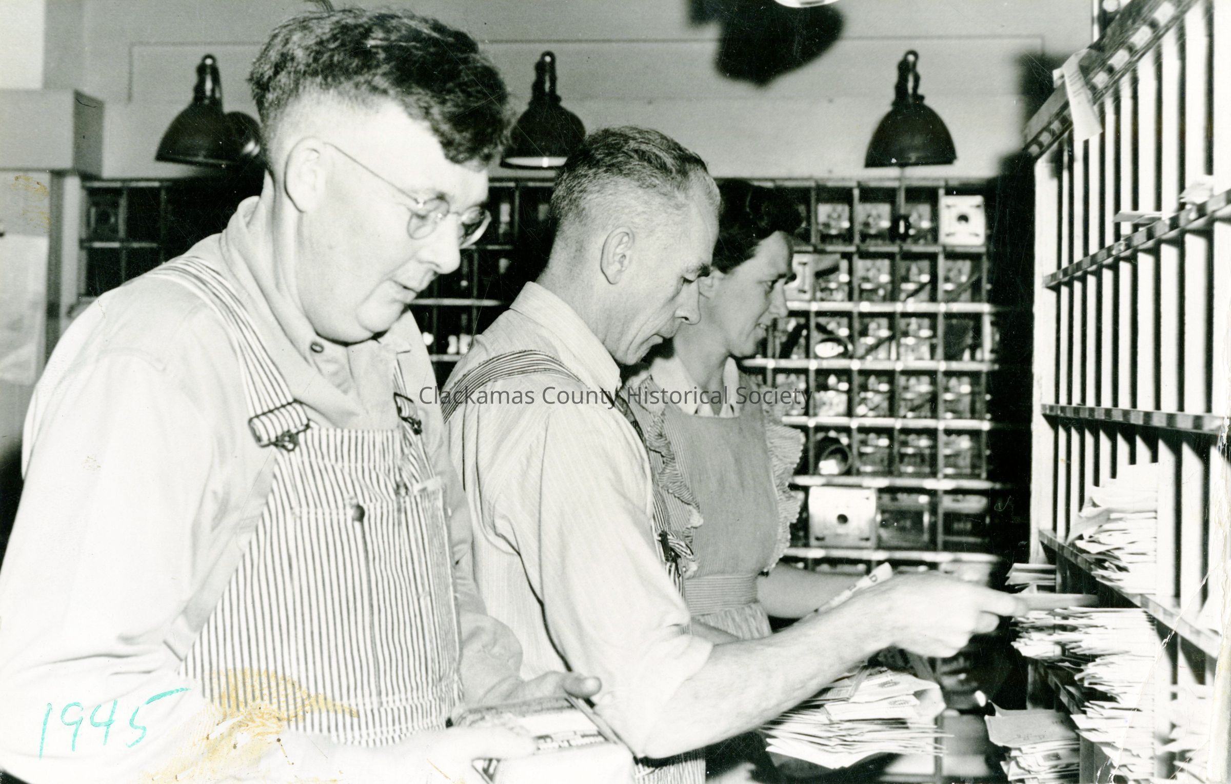 Sorting letters in Oregon City Post Office - 5th and Main Street Fletcher Meighells, Jaredo Blodgett, Grace Helsby - Duplicate of V.1426.002860 E