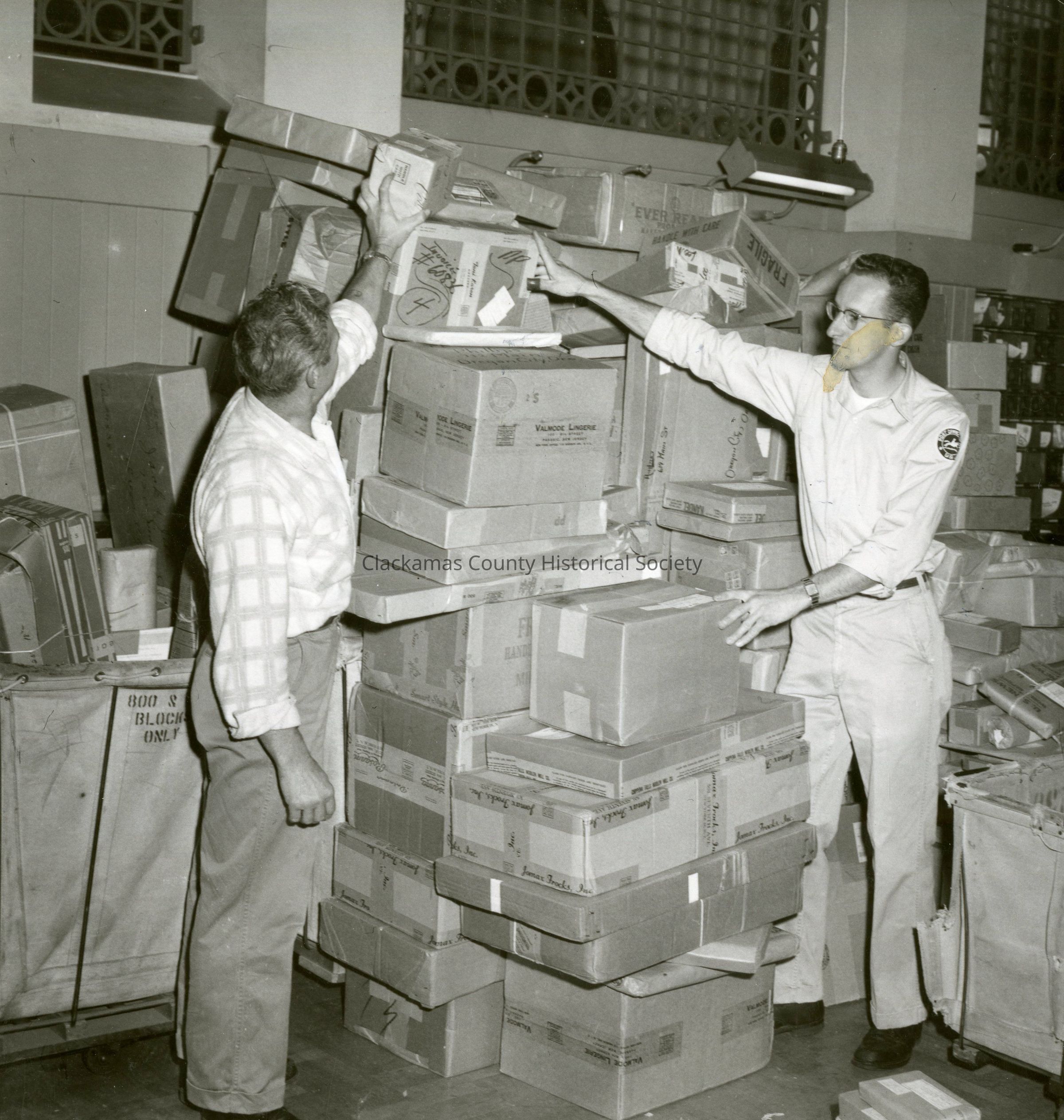 Sorting Packages in Oregon City Post Office - 5th and Main Street Clyde M. Brock, Warren Jewell (later postmaster at Port Orford) U.1426.005136