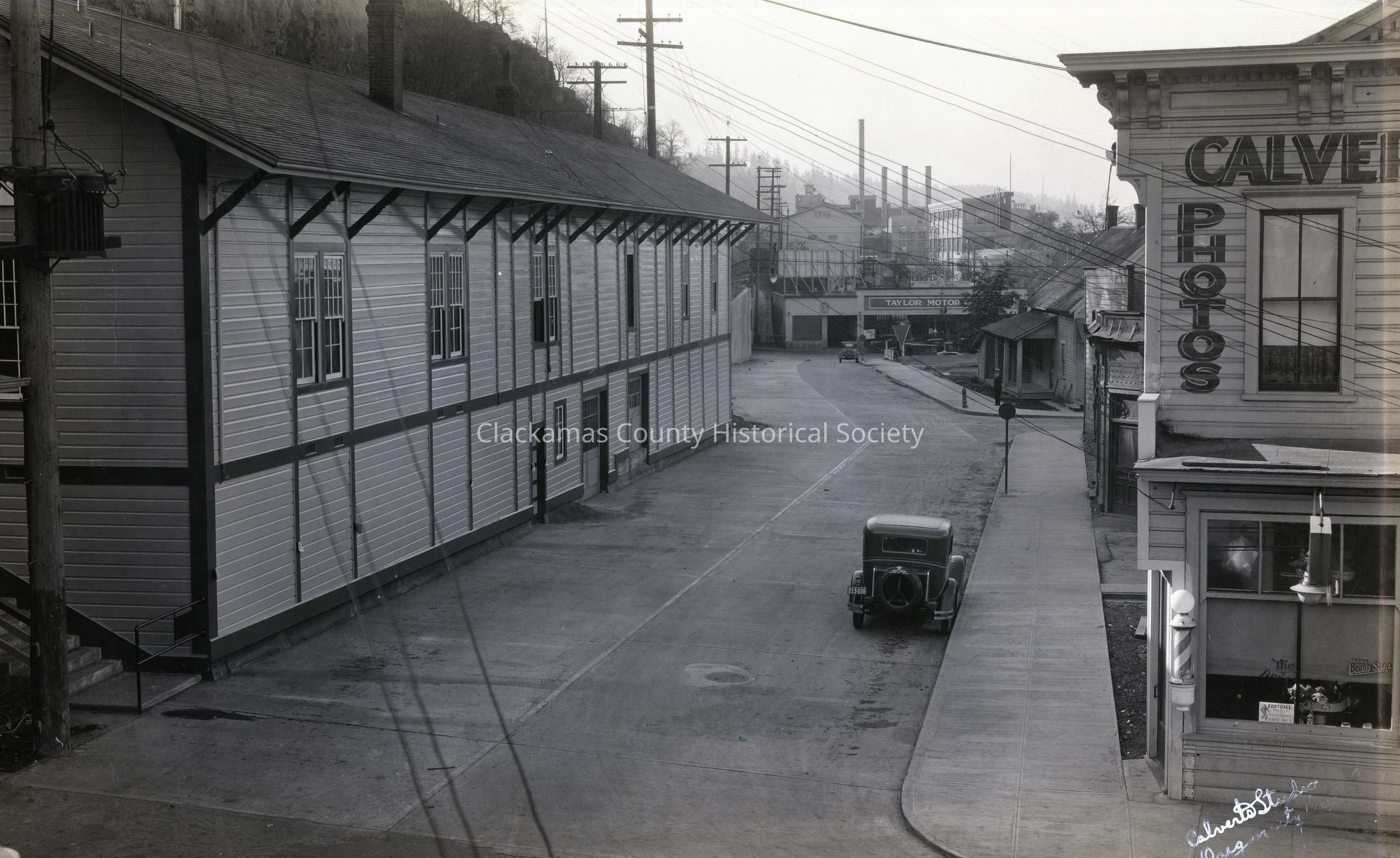 Oregon City Railroad Station looking south from 7th to 5th on Railroad Avenue. "After" widening project.Photo shows the back of the Railroad Station, Taylor Motor, and Calverts Studios. The mill can be seen in the background.Made/Created