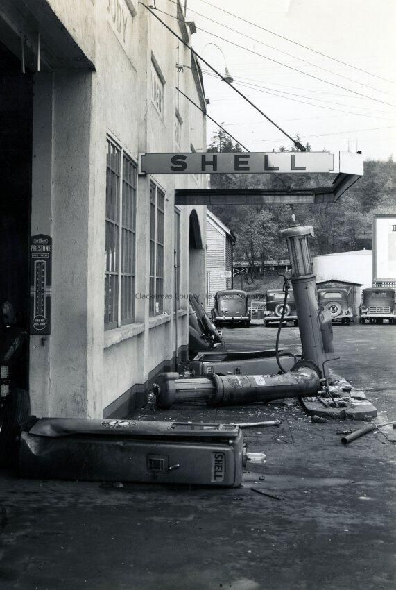 Shell Station. Gasoline pumps, cars, street scene.Made/Created