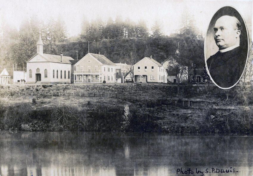 Oregon City St. John's Catholic Church, Rectory and Convent, 10th and Water Streets. Father Hillebrand in top right corner.