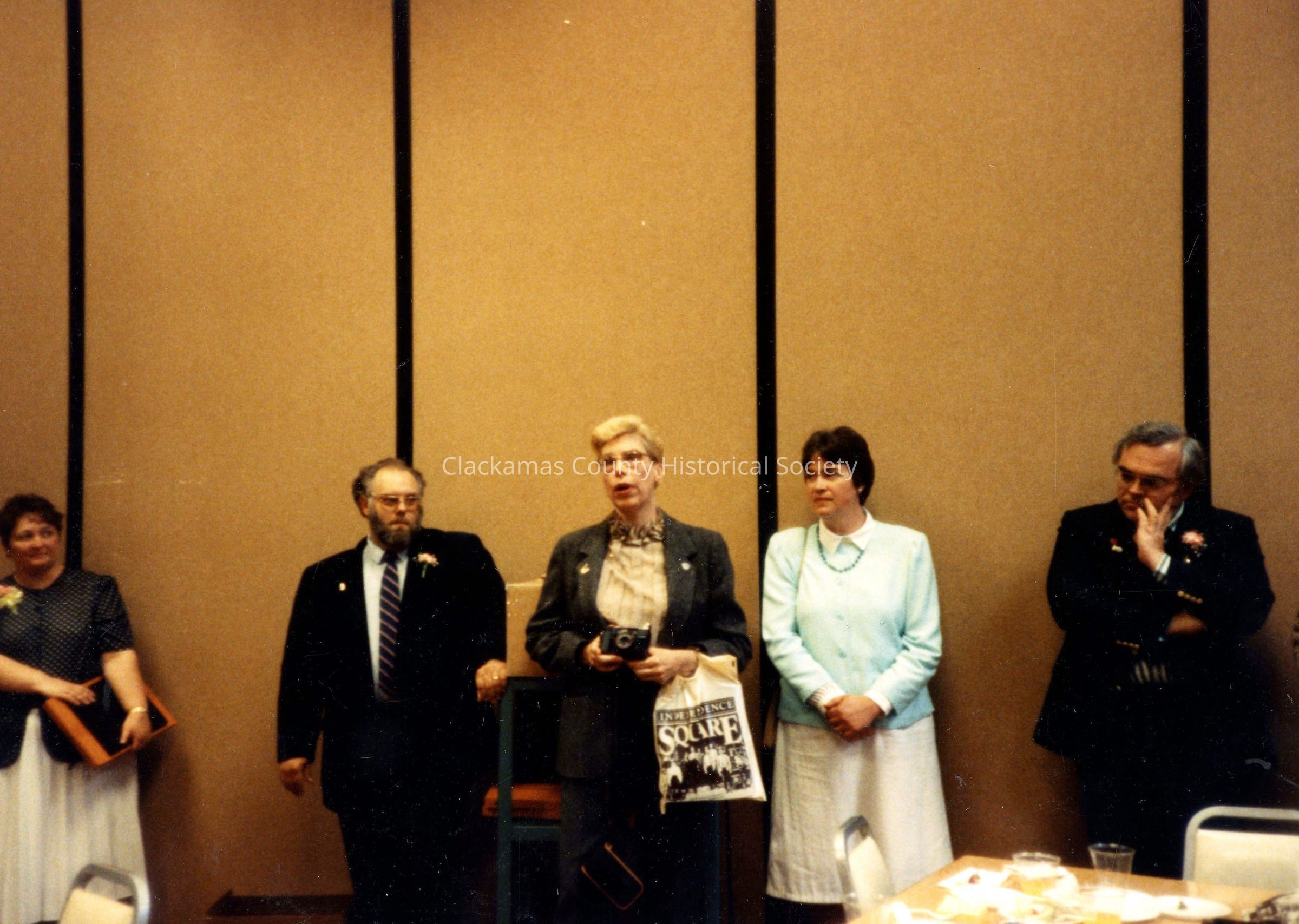 Teacher exchange program, Independence, MO and Oregon City, OR, 1989. The photos are taken in Oregon City. April 24, 1989 photos. L to R - Linda Dakota, Jim Tompkins, Alayne Woolsey, Shelly Tompkins and Wendell Baskins.
