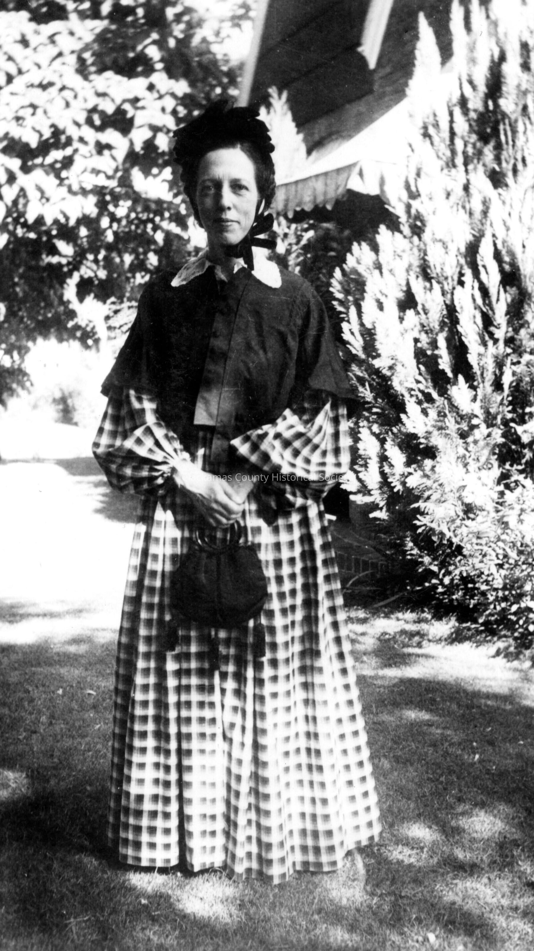Roberta Caldwell in her Territorial Days costume. Note on back reads, "Grandma Beattie's bonnet. Cape and bag from the estate of Mrs Putrow.Made/Created
