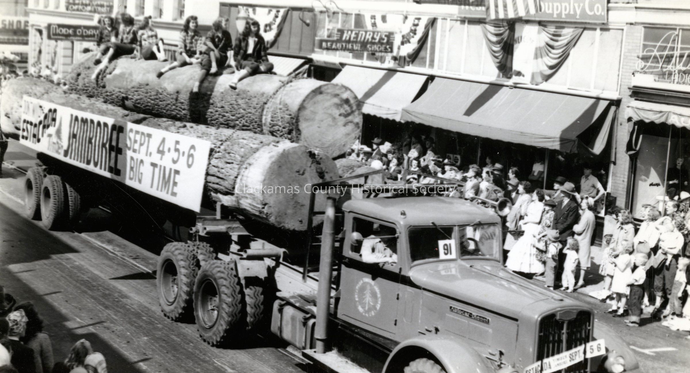 Territorial Days Parade, 6th and Main Street. 1976? Estacada Jamboree float. Logs and log truck. Main street. People along street.
