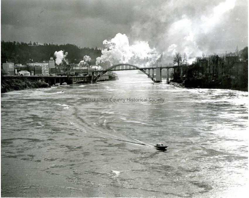 Arch Bridge at Oregon City-West Linn from Abernathy Bridge during dedication of latter bridge (1970).