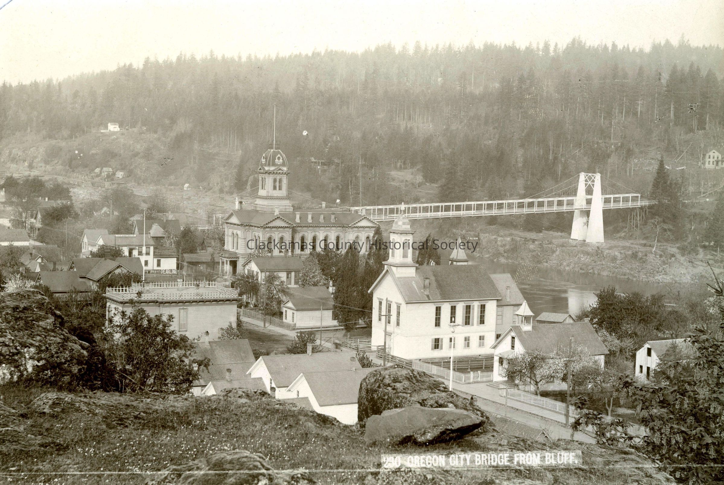 Oregon City-West Linn Bridge over Willamette River from Bluff. Oregon City is in the foreground. Photo shows Courthouse, Baptist Church, and Catholic School. 1888.