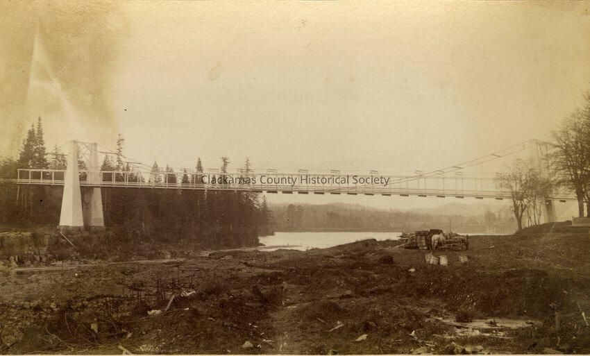 Oregon City/West Linn Suspension Bridge, looking downriver. This is the first bridge (free) over the lower Willamette River, same location as the present Arch Bridge.Made/Created