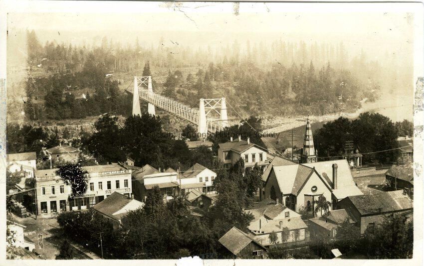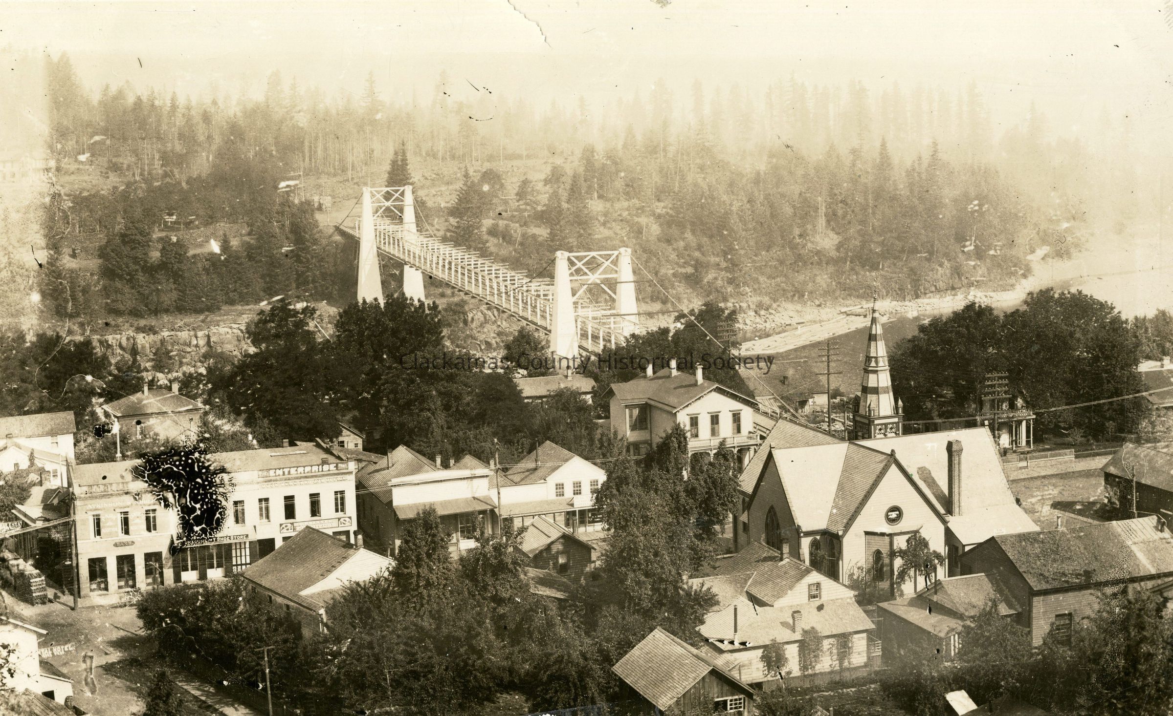 Oregon City-West Linn Suspension Bridge over Willamette River from Bluff. Oregon City is in the foreground. 1893. Photo shows Enterprise building.Made/Created