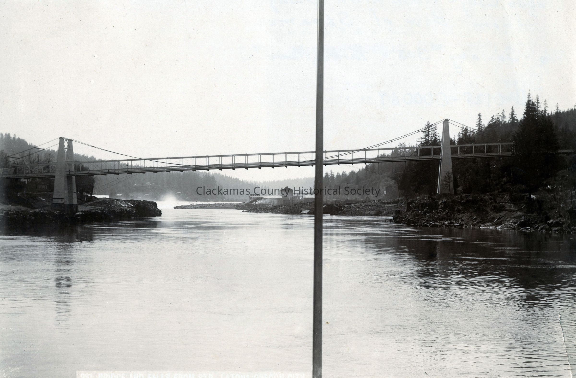 Oregon City/West Linn Suspension Bridge, looking south toward the Willamette Falls.Made/Created