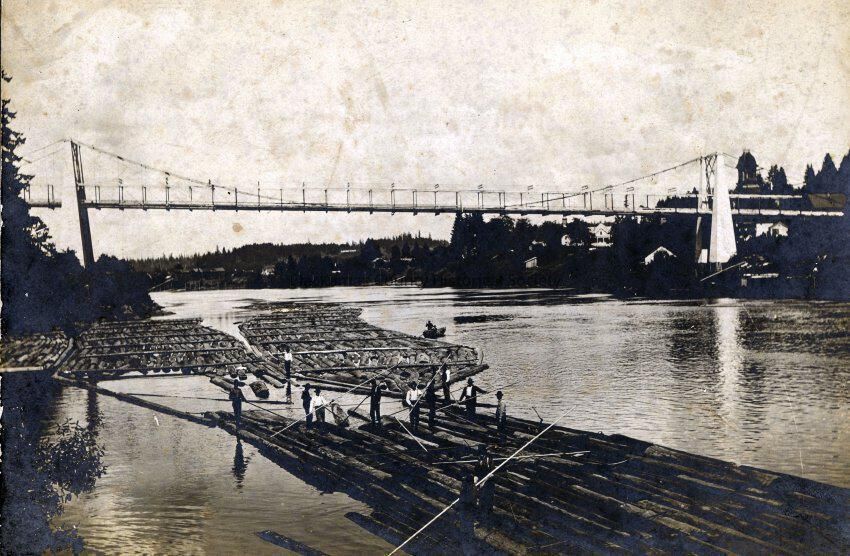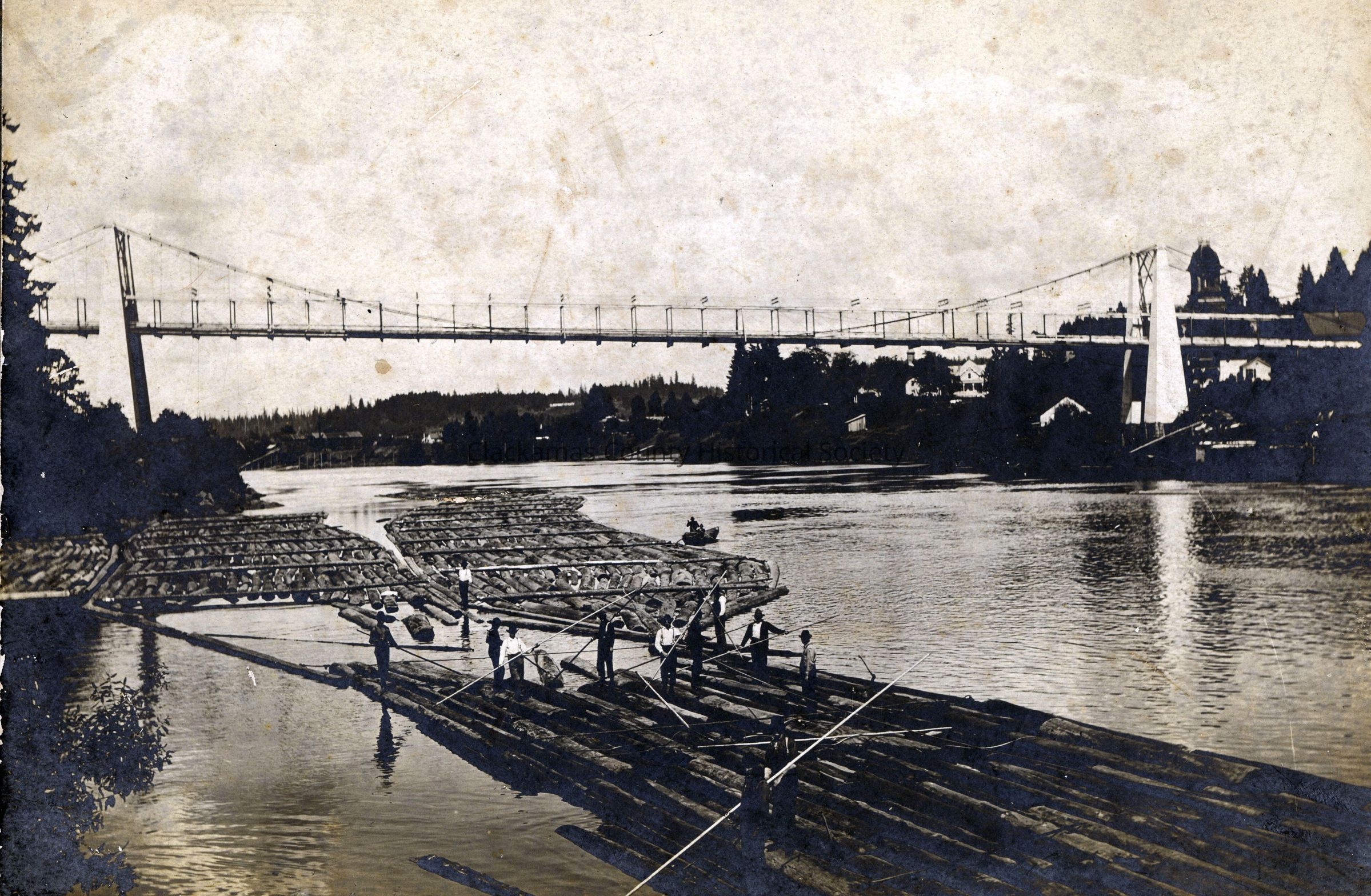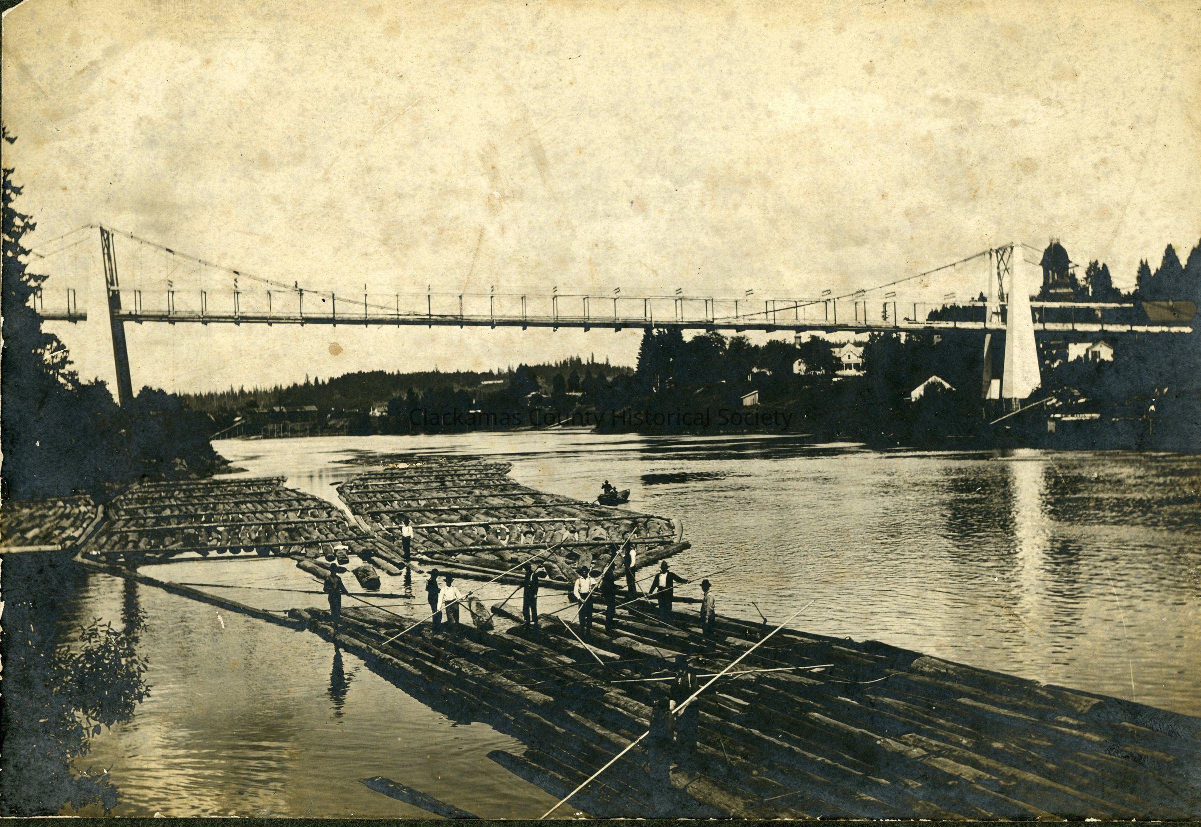 Oregon City/West Linn Suspension Bridge. Logs being floated underneath the bridge.Made/Created