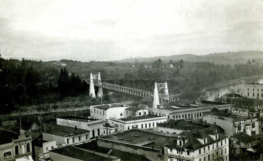 Suspension Bridge at Oregon City-West Linn over Willamette River. The W. B. Eddy building on the lower right shows the damage from the recent fire. The Stevens' "Ferdinand Wilde" House is in the lower right of the image (JAH 12/2022).