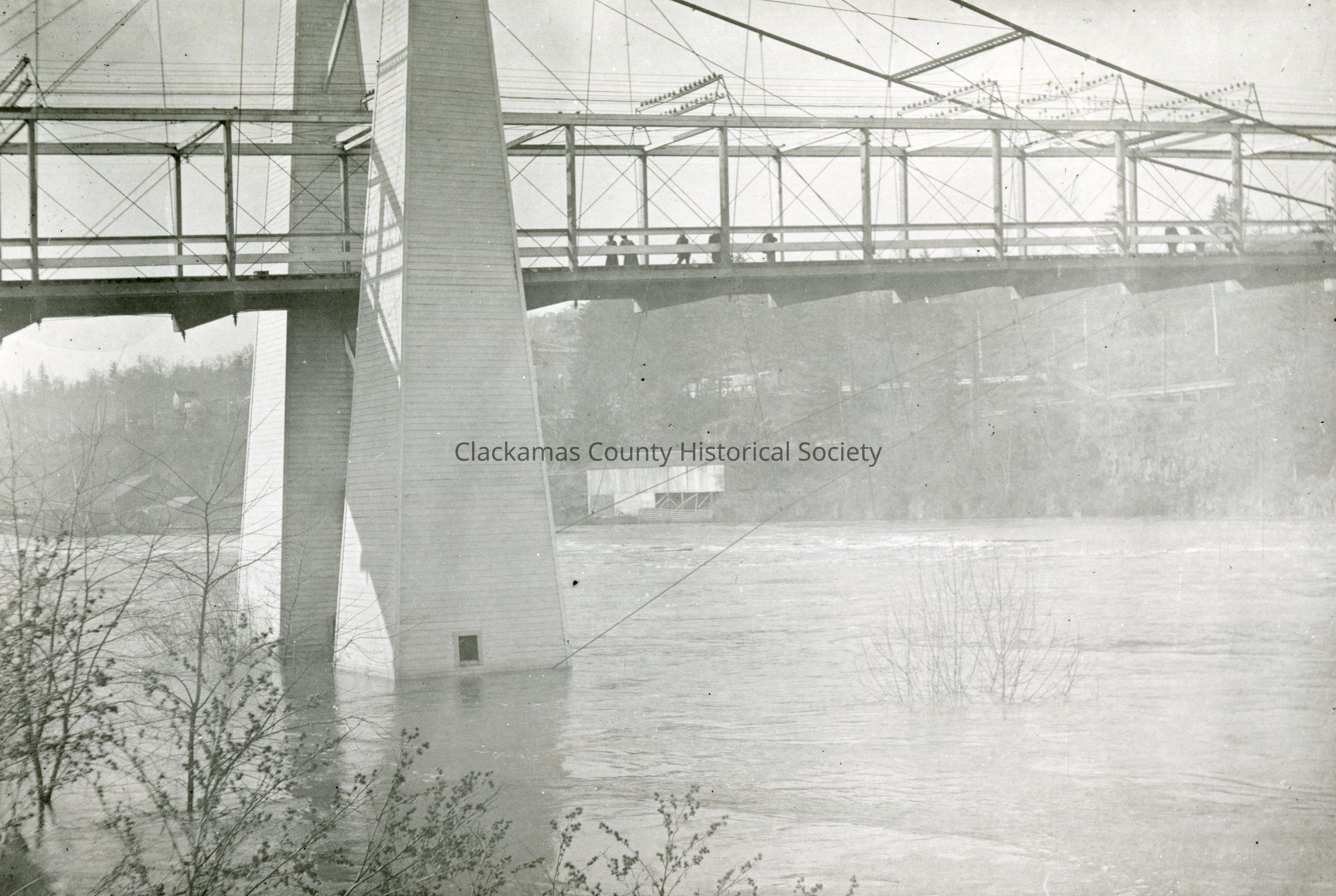 Oregon City-West Linn Suspension Bridge over Willamette River. Photo shows river-level view.Made/Created