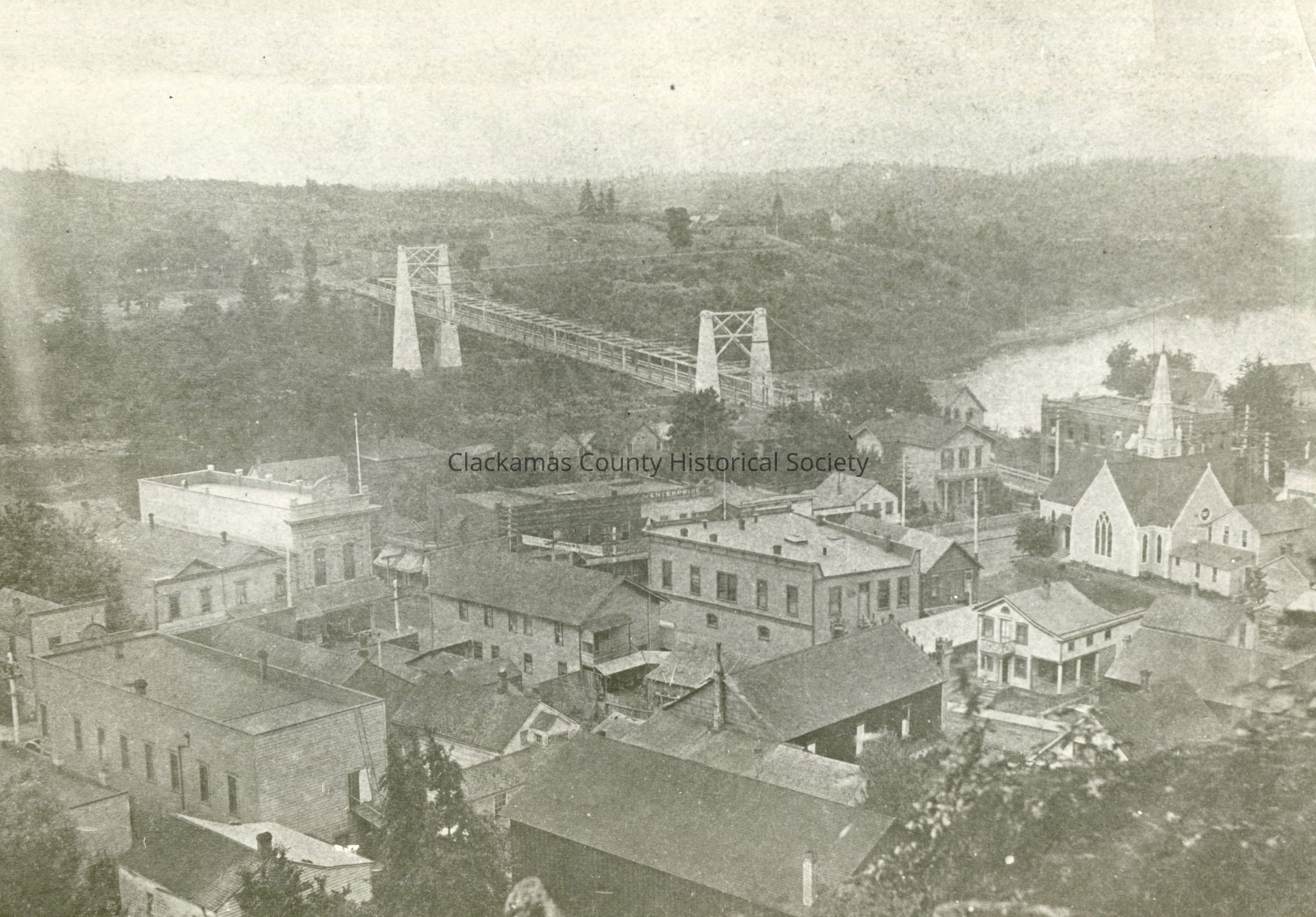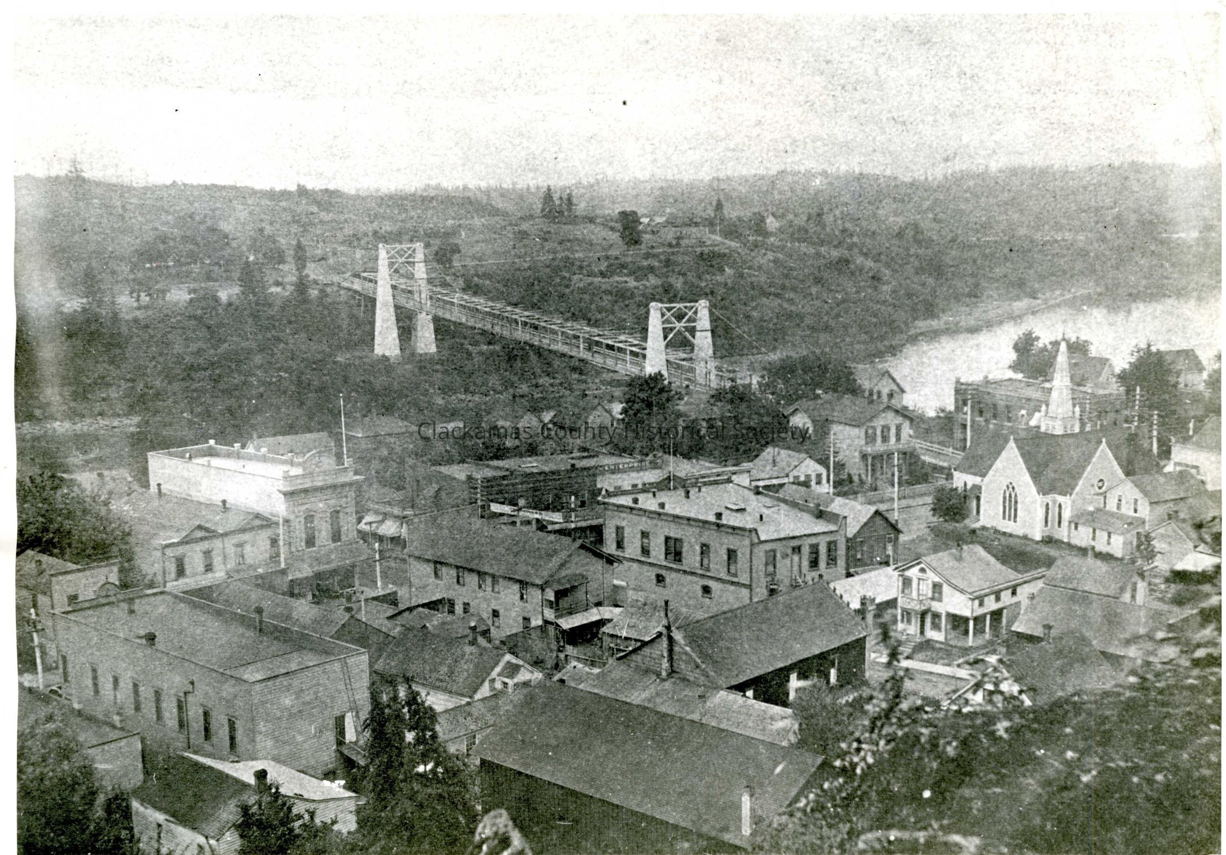 Oregon City-West Linn Suspension Bridge over the Willamette River from Bluff was built in 1888. Oregon City is in the foreground. The "Wilde House" at the lower right corner originally stood at the corner of 6th and Main until 1900, when it was pulled back to construct the building to its left. The property was owned by H.C. Stevens (JAH).Made/Created