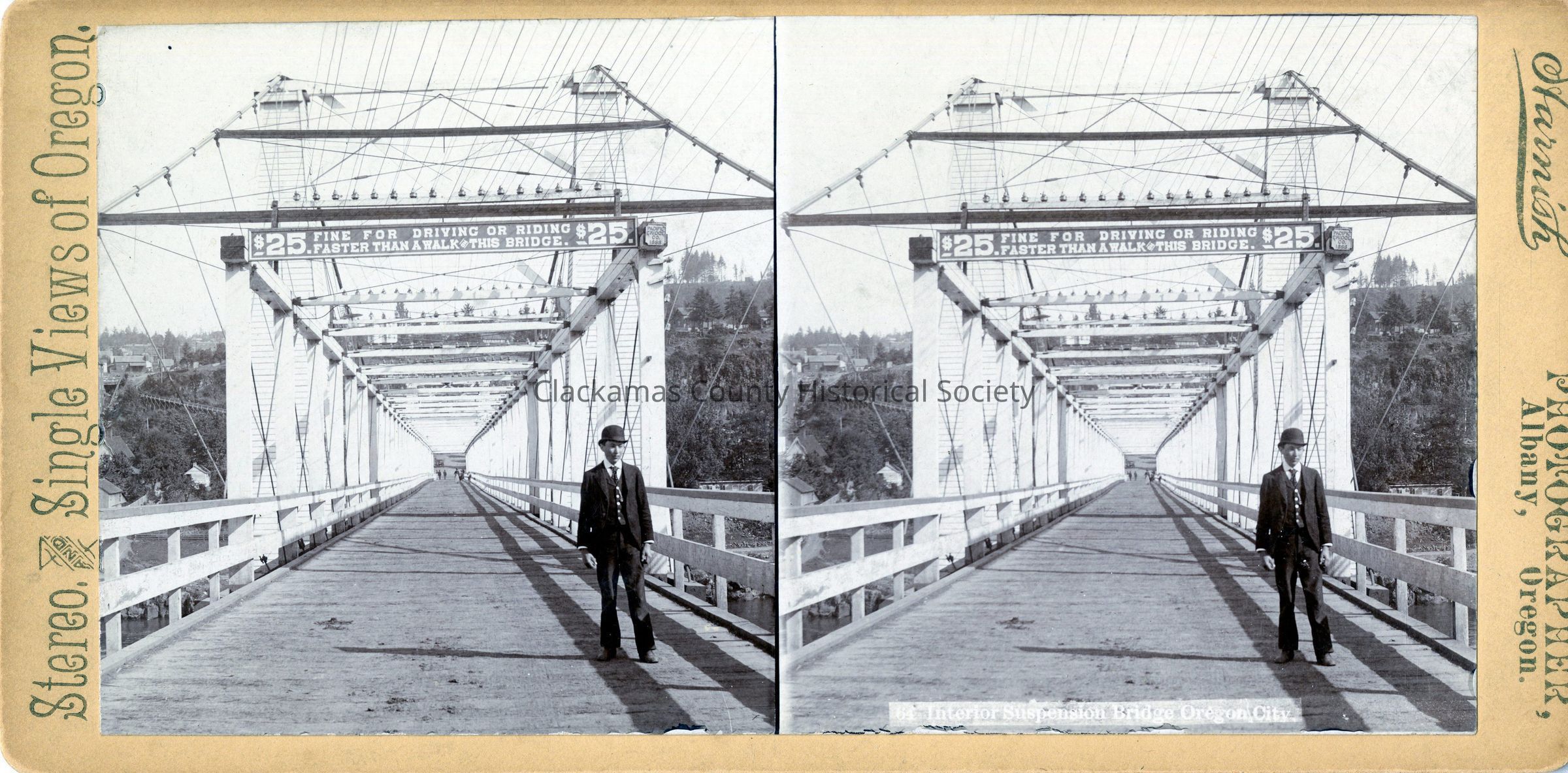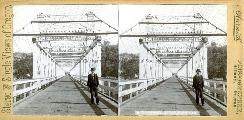 Suspension Bridge at Oregon City-West Linn over Willamette River. 1888. Looking toward Oregon City. Stereoview photograph by Harnish, Albany, Oregon.Made/Created