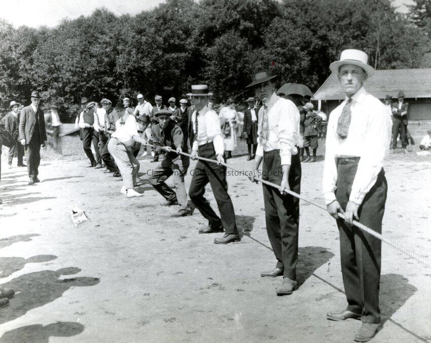 Tug of War at Crystal Lake, early 1920's. Mill picnic. Milwaukie, OR. Men's tug of war.
