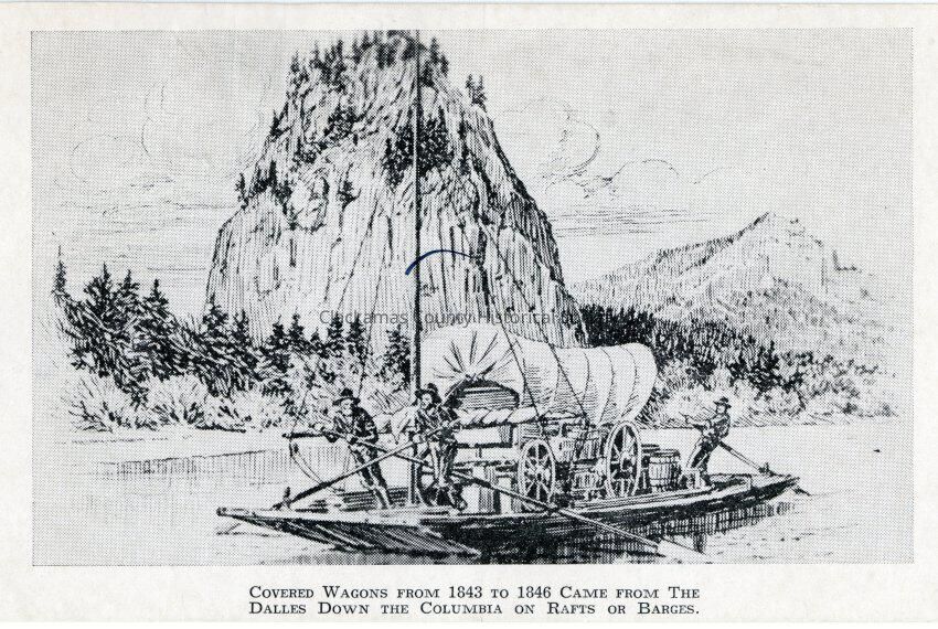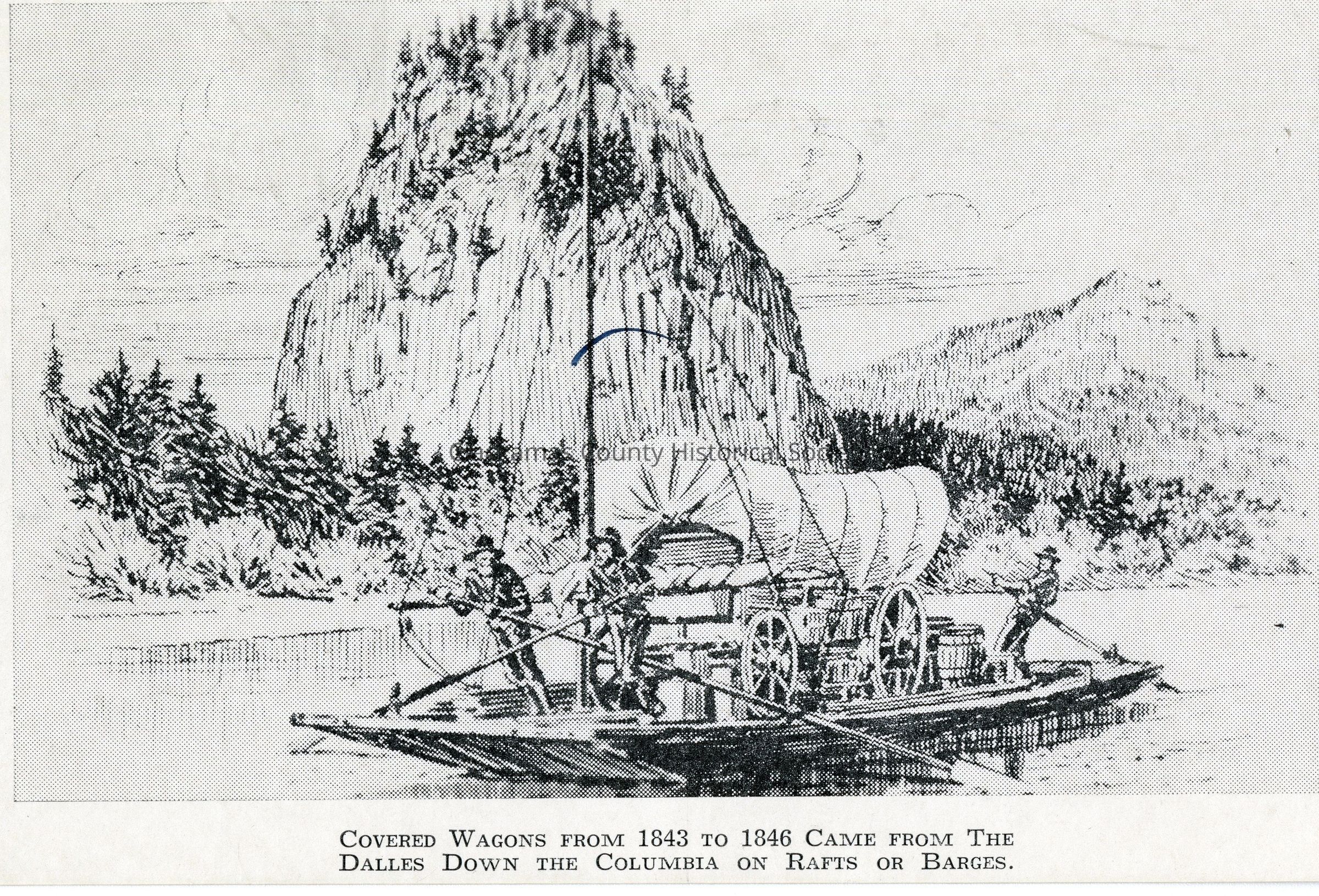 Covered wagons from 1843 to 1846 came from The Dalles down the Columbia on rafts or barges.Made/Created