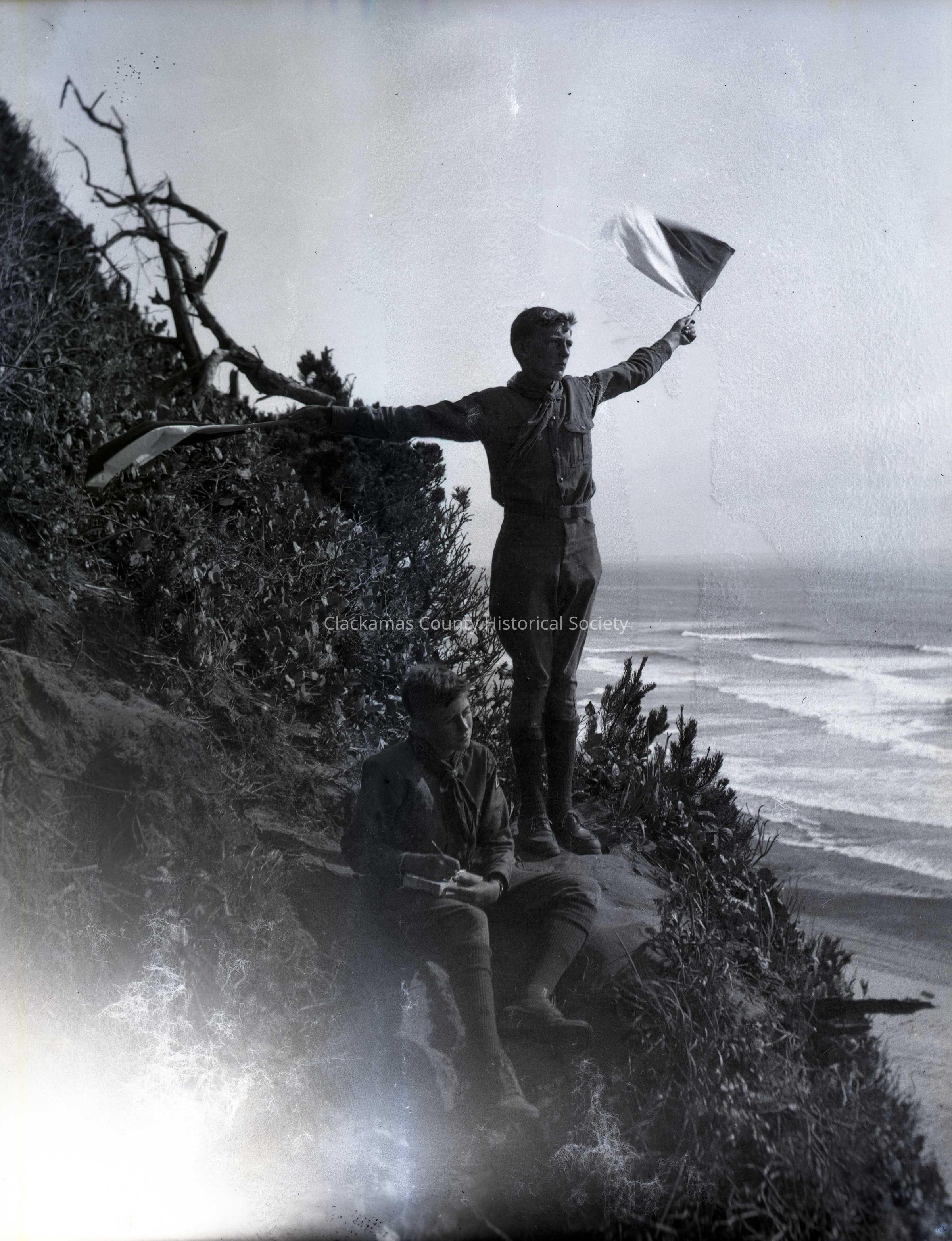 Osborn and Eberly signing with flags at Boy Scouts Camp Merriwether, Oregon - negativeMade/Created