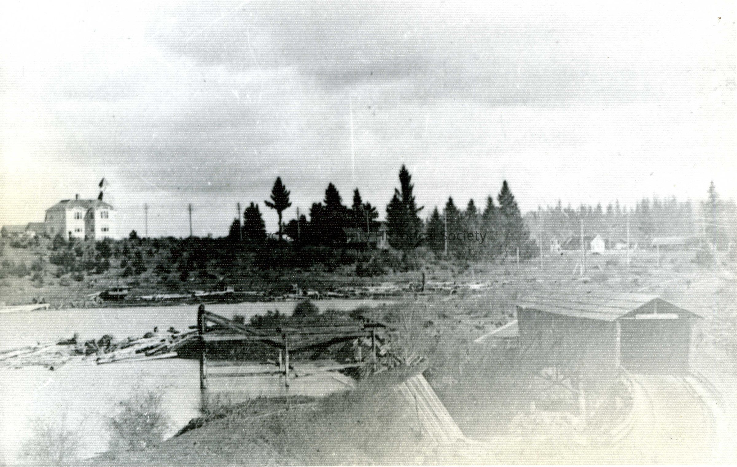 Oswego Bridge near mouth of Sucker Creek at Oswego. Old Lakewood School is on hill at left. Old town of Oswego is in the background.Made/Created