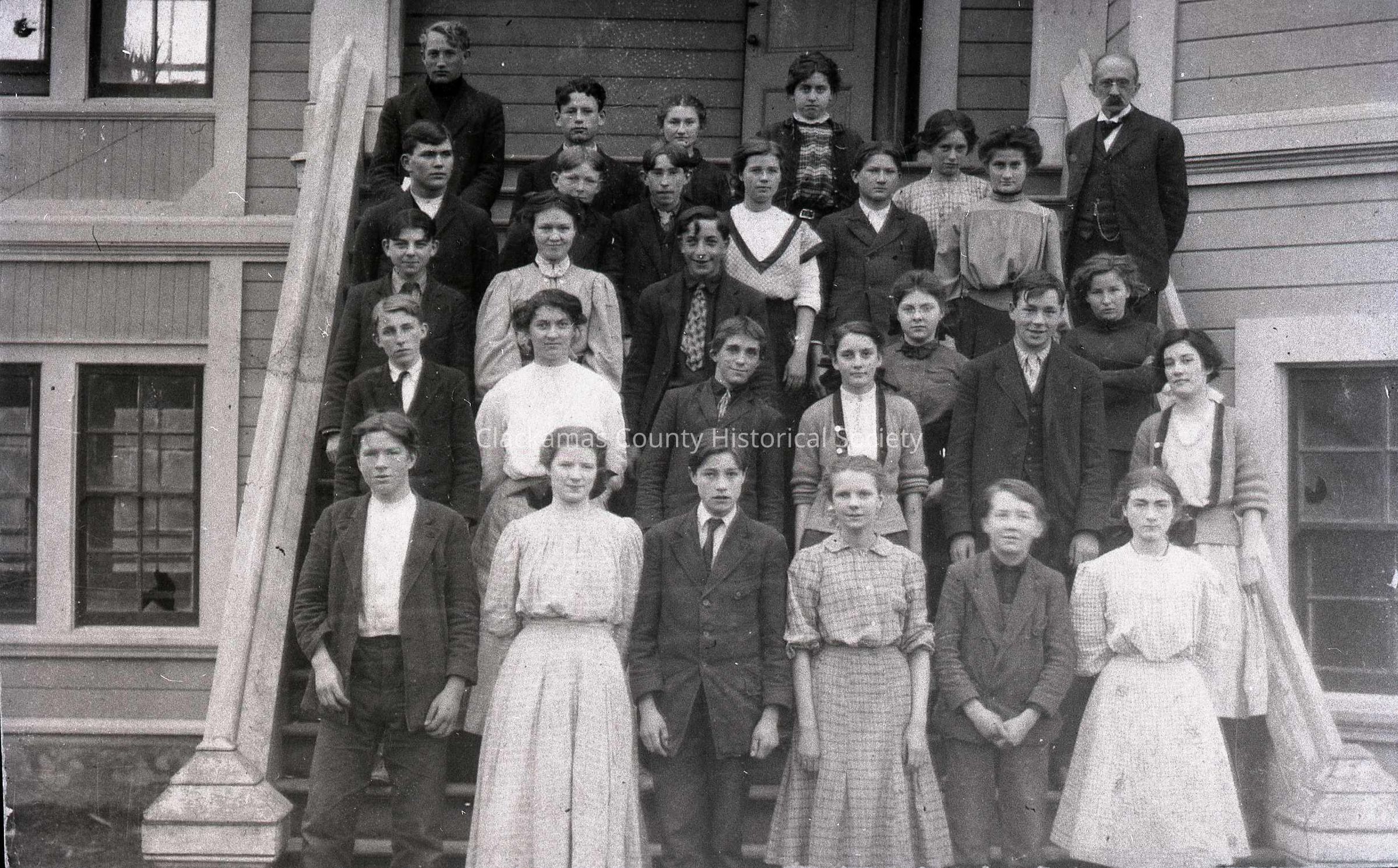 Bottom Row (L-R): Heppell Shipley, Isa Austin, Henry Gans, Ruth Erickson, Lester Jones, and Gladys Vates; 2nd Row L-R): Arce Jones, Nina Worthington, Eugene Waldorf, Tucie Todd, Clifford Johnson, and Arva Todd; 3rd Row (L-R): clyde Churchill, Margaret Jones, Otto Bethke, Mabel Churchill, and Ettie Wilson; 4th Row (L-R): Willie Nagt, Abert Rosentrater, John Conway, Mary Jarisch, Ray Duncan, Anna Duncan, and Clare G.Morey (Teacher); Top Row (L-R): Lester Lelilneblter (visitor), Thomas Elston, Hariet Duncan, Dena Prosser, Bertha Elston.Made/Created
