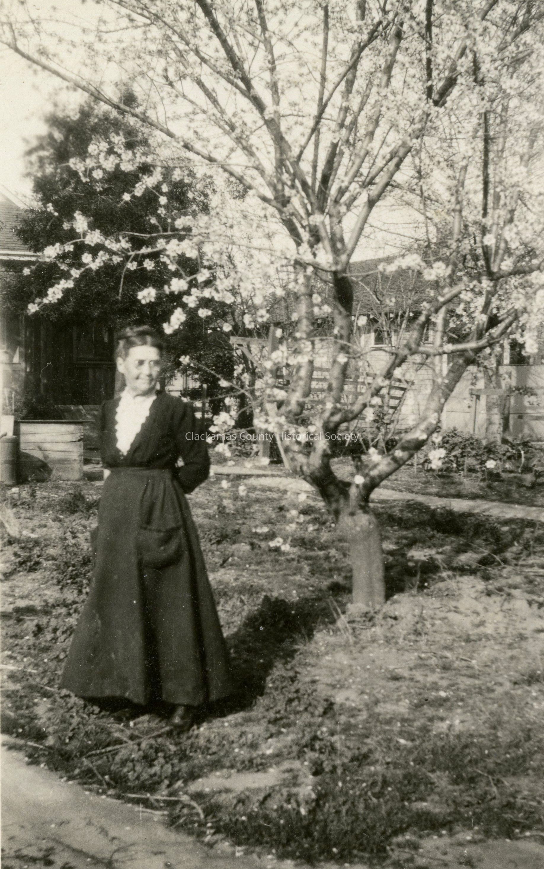 Anna (Davis) Palmateer, standing outside in front of blossoming tree