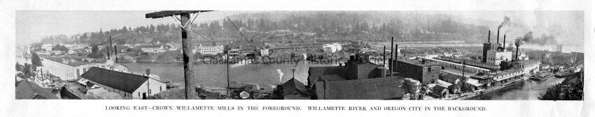 Panoramic view of Crown-Willamette mills, West Linn, Oregon. Picture from book. Oregon City in background.Made/Created