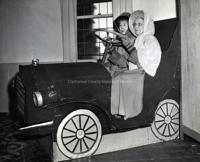 Note on back: "Mrs. Clara Cox (right) and June Charman (left) constructed this "car" from a large paper box from Friedrich's Hardware Store. Other gadgets were added - lamp black used for paint, tin cans for headlights, etc. This was for a church benefit entertainment in 1952. Ha!"Made/Created