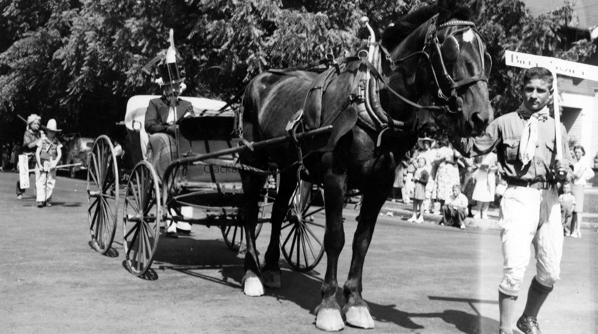 Horse and buggy in parade. Unidentifed persons.Made/Created