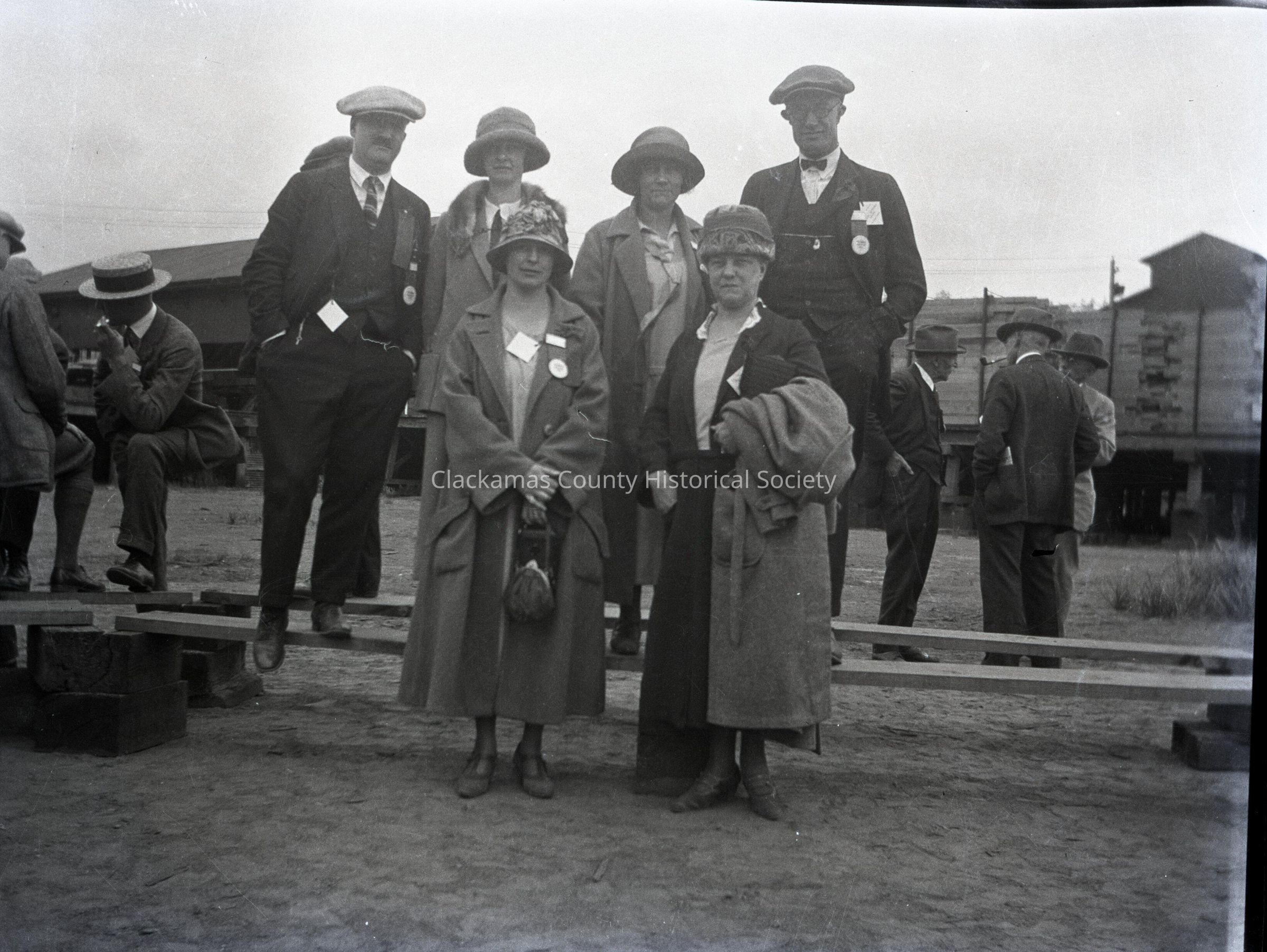 Group of 11 People in front of sawmill. Same setting as 2008.008.004.102. Note says: "Mrs. Bob Elkins, Where tree is broken in two toward Molalla, Knoop's livery stable at 17th and Main, time 1913. At time M.W.S. came to Mulino, Chet Carruthers may know." The date 1924 is listed on the envelope.Made/Created