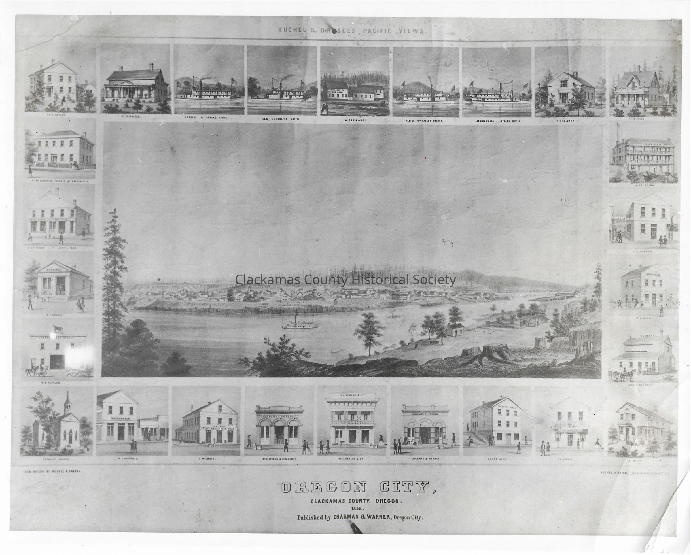 Photograph of a poster. Poster shows Oregon City in 1858 and is surrounded with sketches of various buildings in Oregon City in 1858. Poster created by Charman & Warner, Oregon City. Unknown when photograph taken.