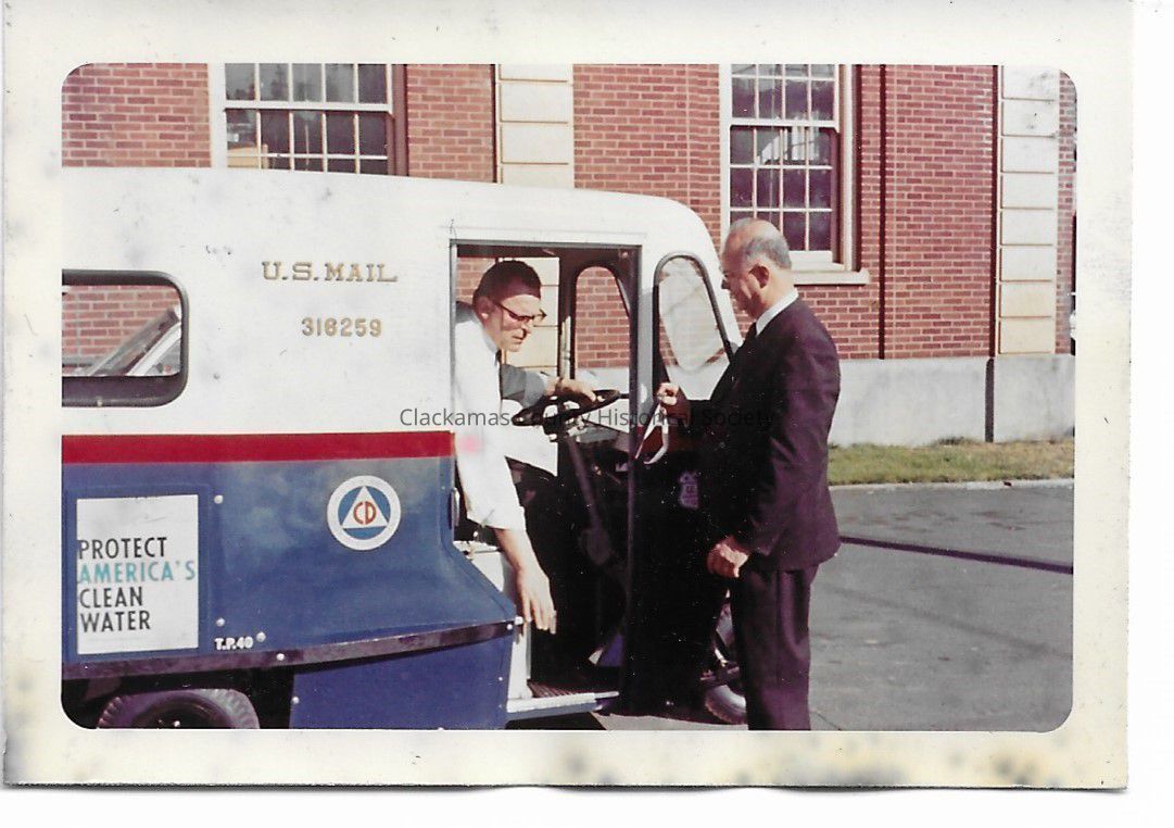Photograph of unknown man, with a post office delivery vehicle (Mailster). Unknown person in vehicle.
