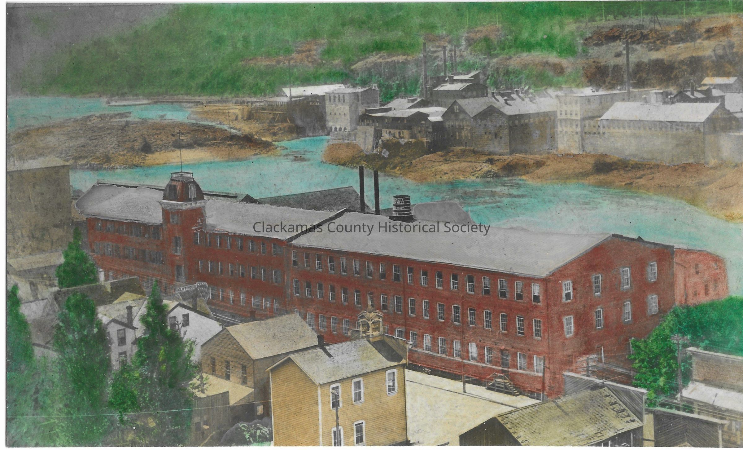 Sketch of paper mills in Oregon City. Perspective is from the bluff looking west and south. Shows paper mills on both sides of the river.